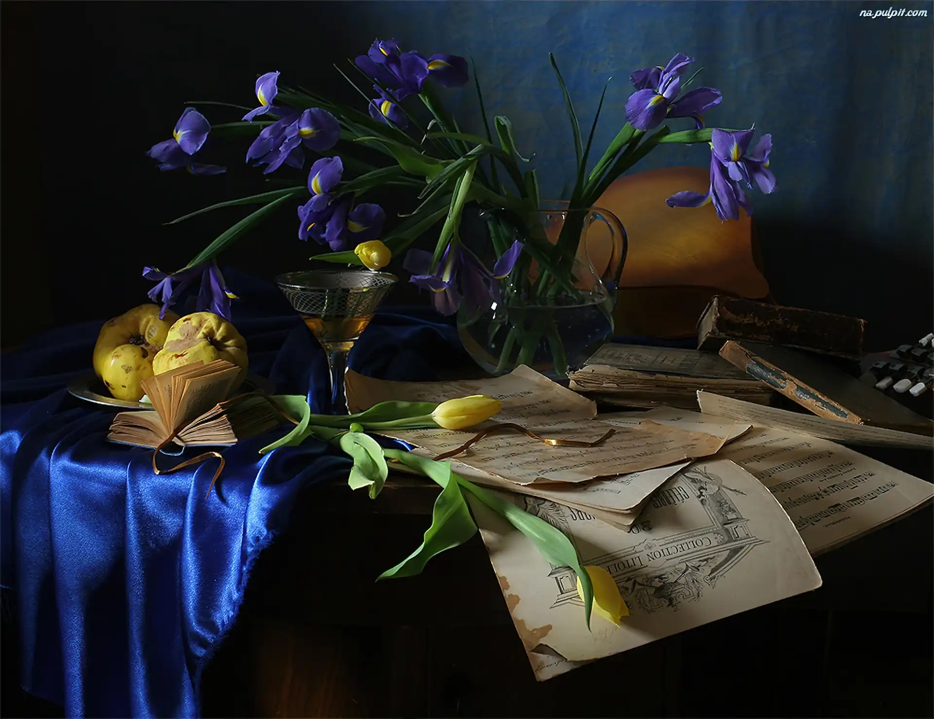 Wina, Tulipany, Irysy, Kompozycja, Lampka