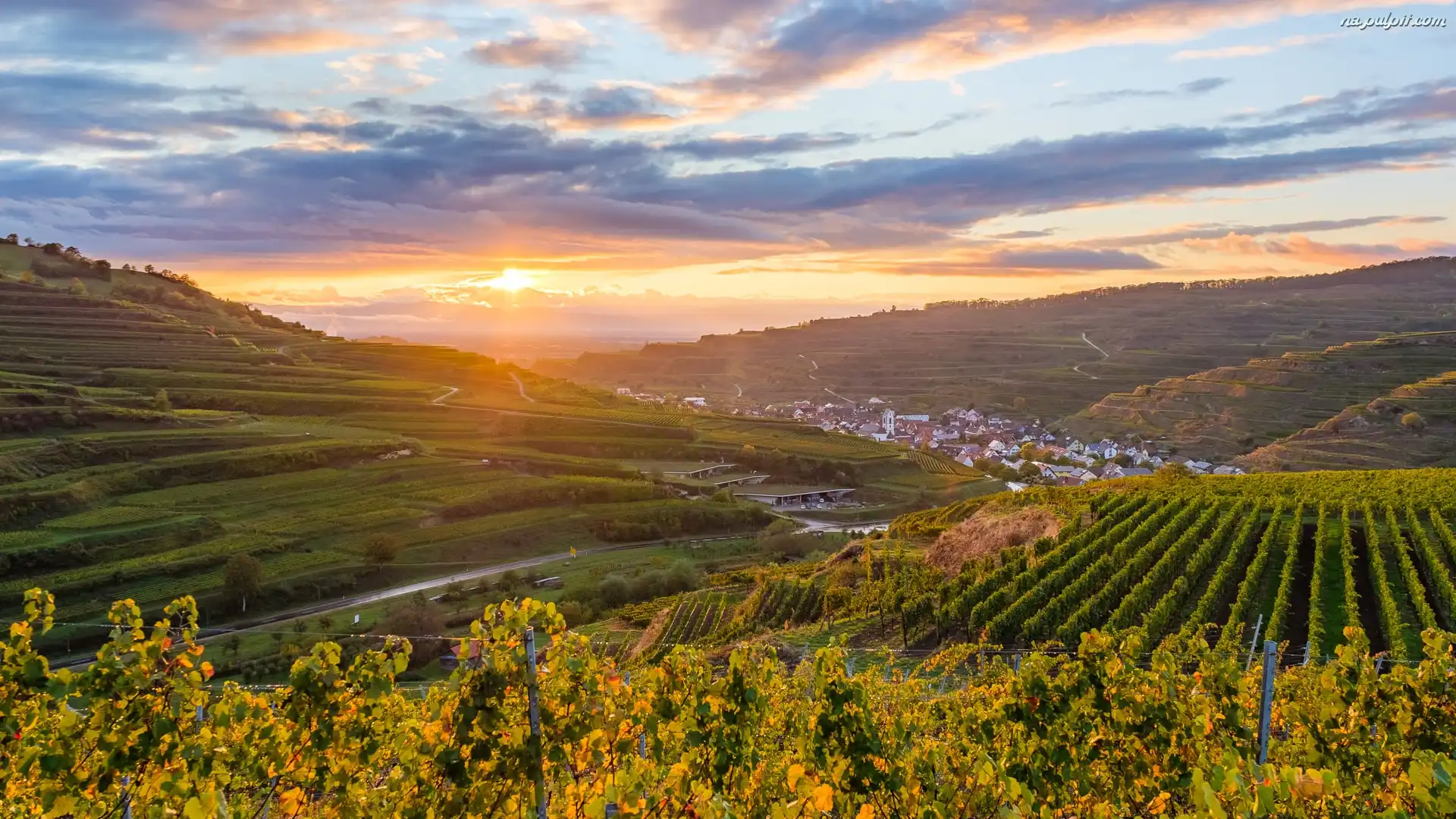 Wschód słońca, Kaiserstuhl, Domy, Badenia-Wirtembergia, Niemcy, Plantacja, Wzgórza, Winnice Na Pulpit |