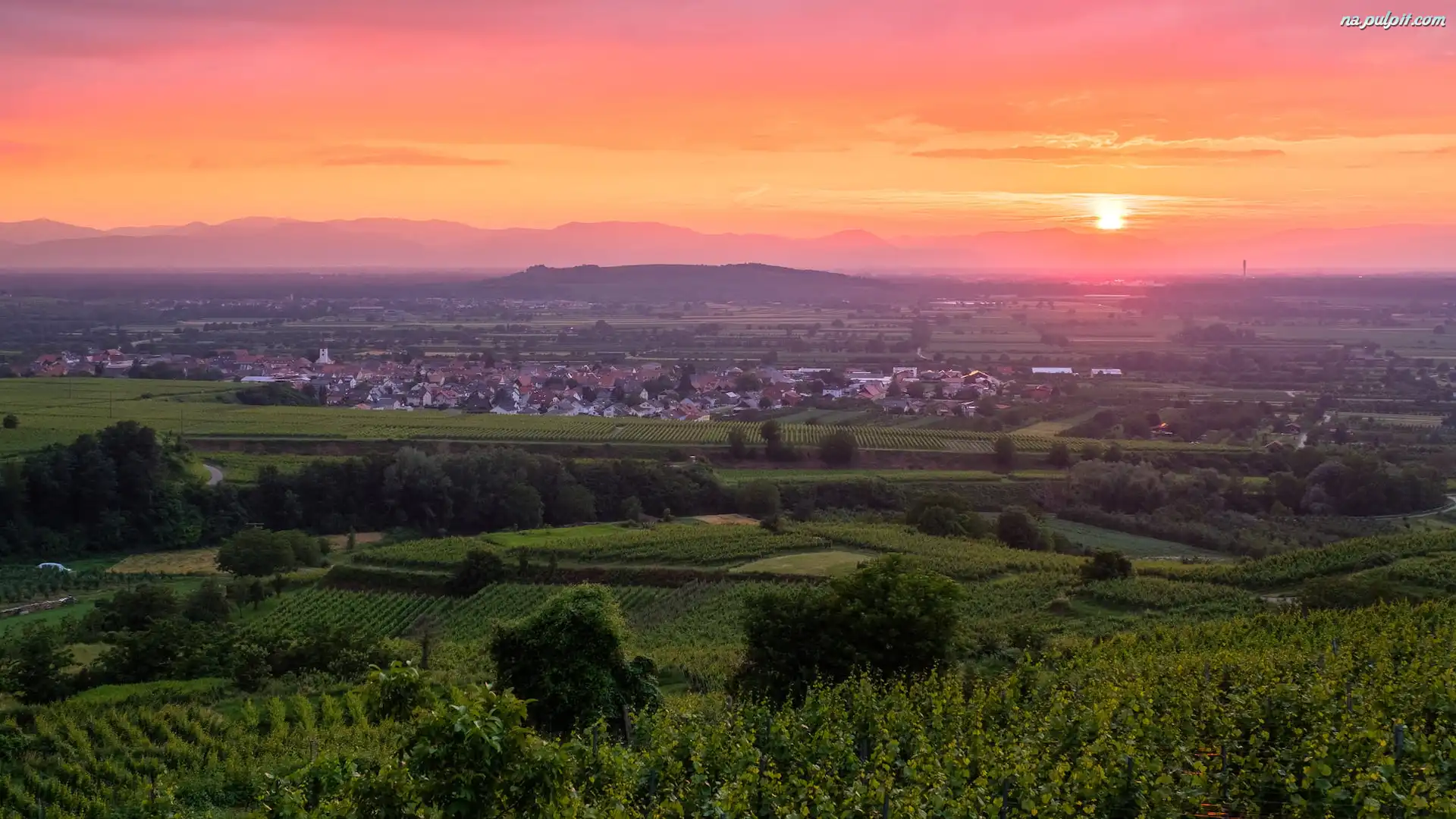 Kaiserstuhl, Winnice, Drzewa, Zachód słońca, Niemcy, Wzgórza Na Pulpit