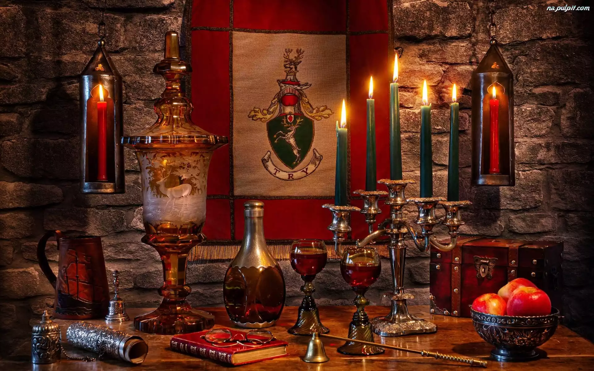 Kieliszki, Kompozycja, Karafka, Wino, Świece, Jabłka Na Pulpit