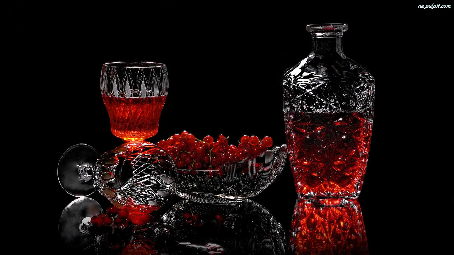 Czerwona porzeczka, Karafka, Kieliszki, Odbicie, Czarne tło, Kryształ, Kryształowa, Wino Na Pulpit |