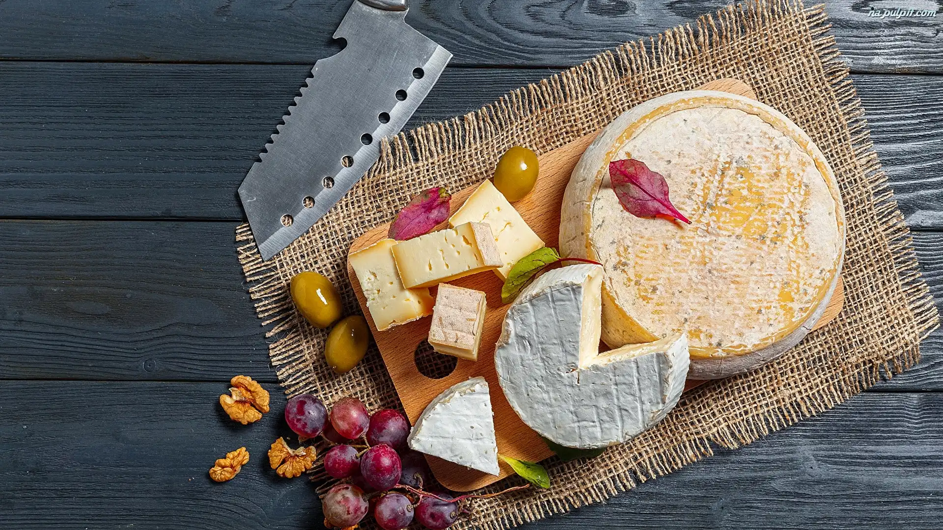 Winogrona, Nóż, Serwetka, Oliwki, Sery, Deska