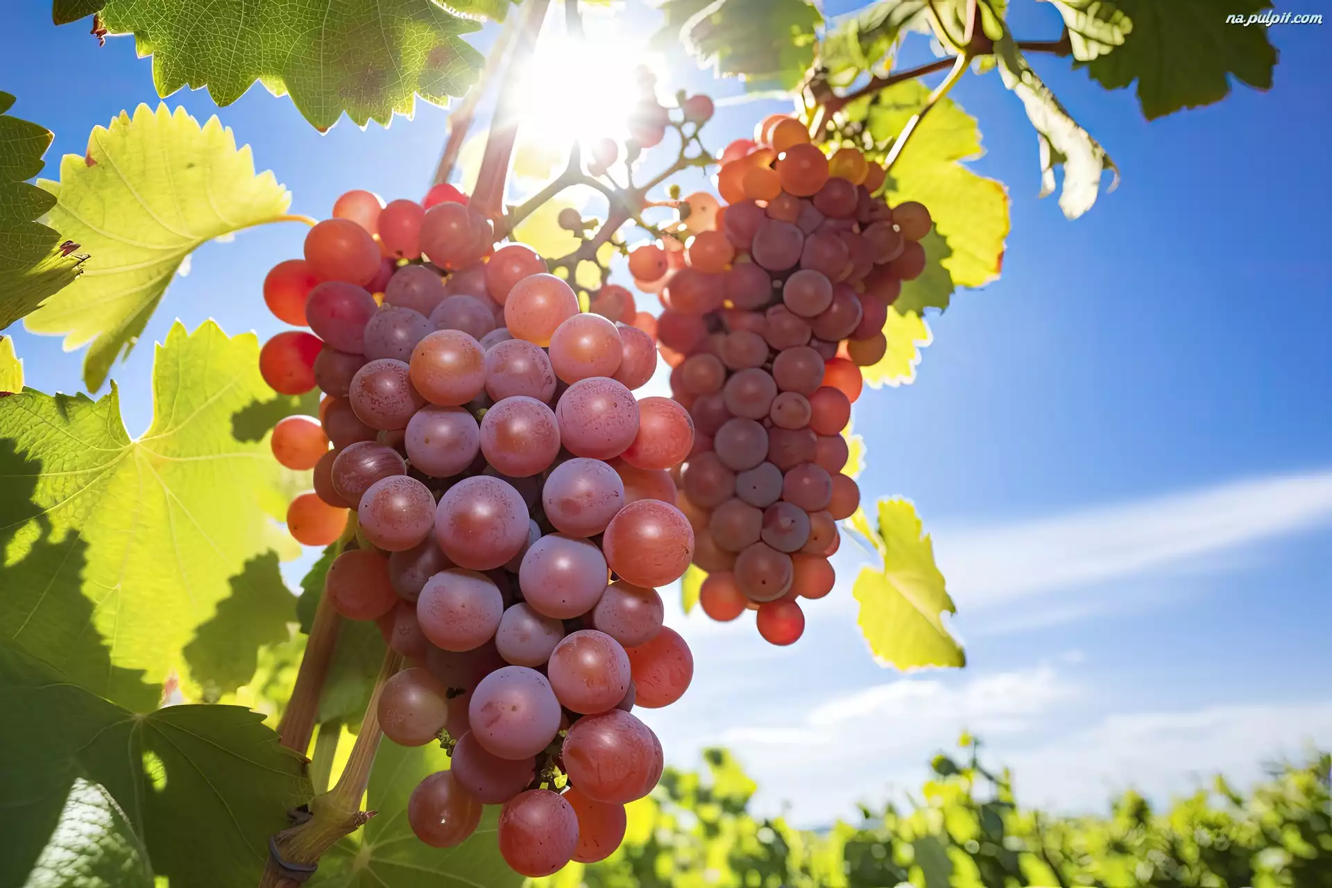 Grafika, Słońce, Liście, Winogrono, Czerwone, Kiść, Niebo Na Pulpit