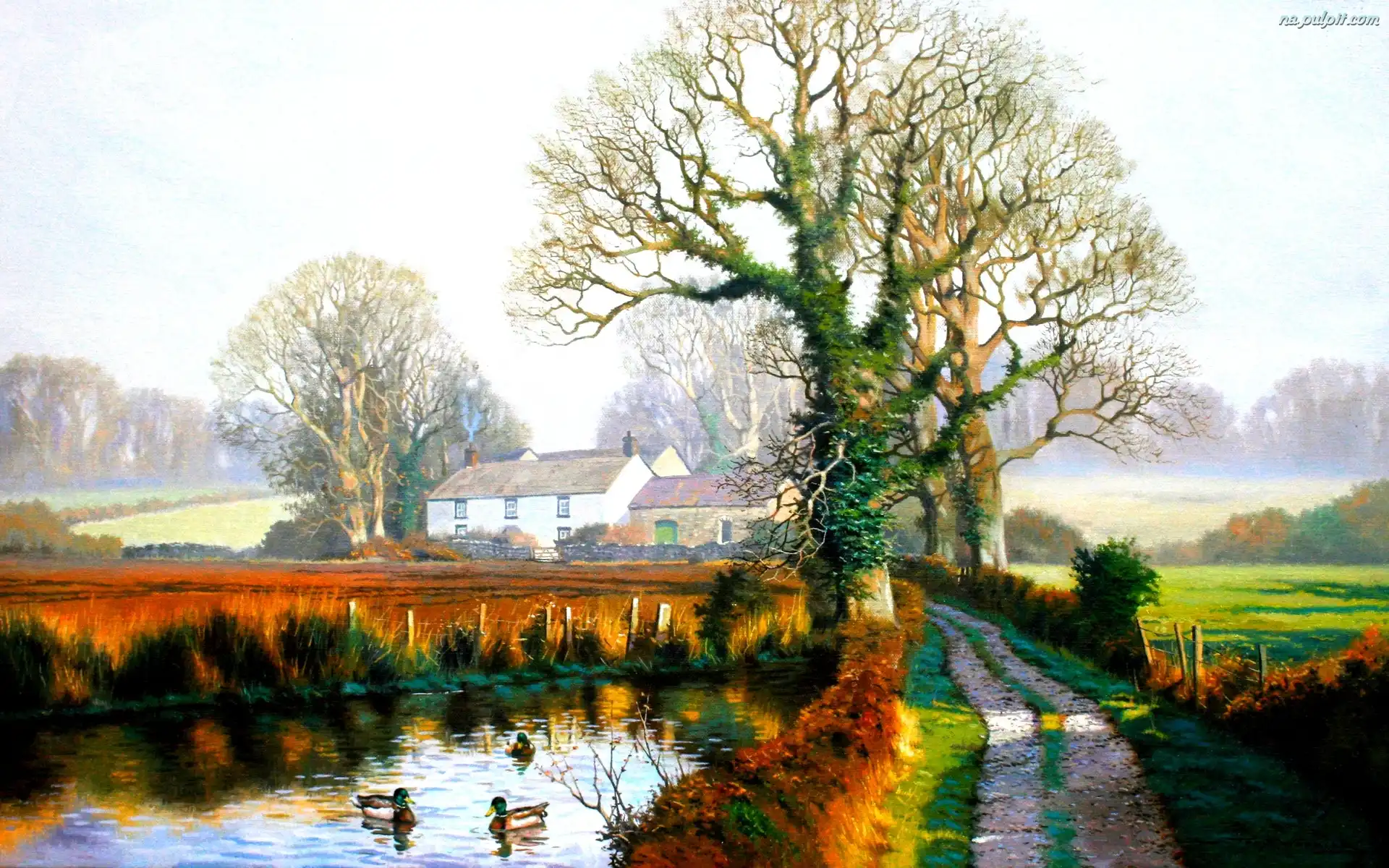 Wioska, Staw, Kaczki, Drzewa, Droga, Domy Na Pulpit