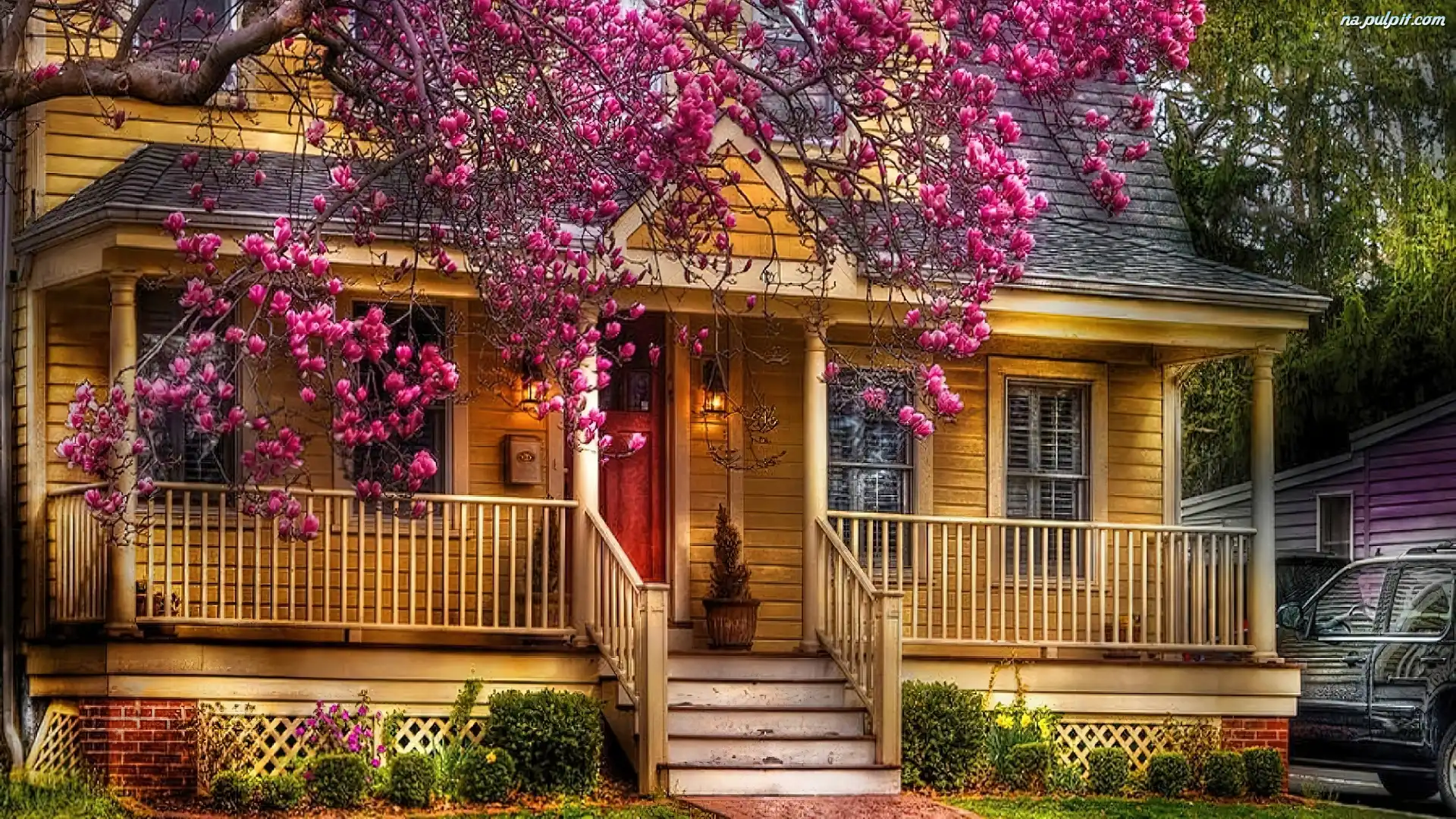 Wiosna, KwitnÄ…ce, Schodki, Dom, Drzewo Na Pulpit