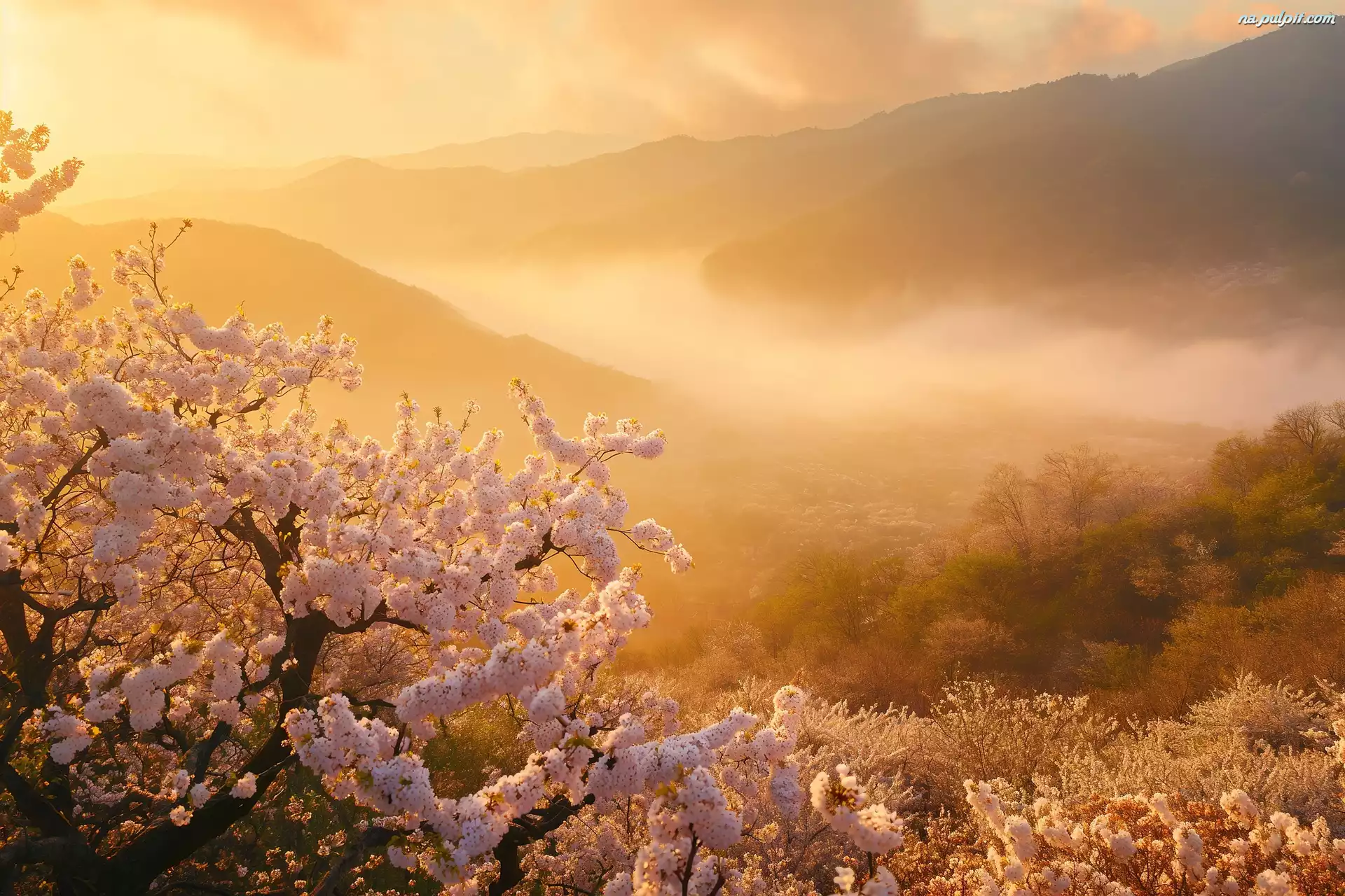 Poranek, Mgła, Gałązki, Wiosna, Okwiecone, Drzewo, Góry Na Pulpit