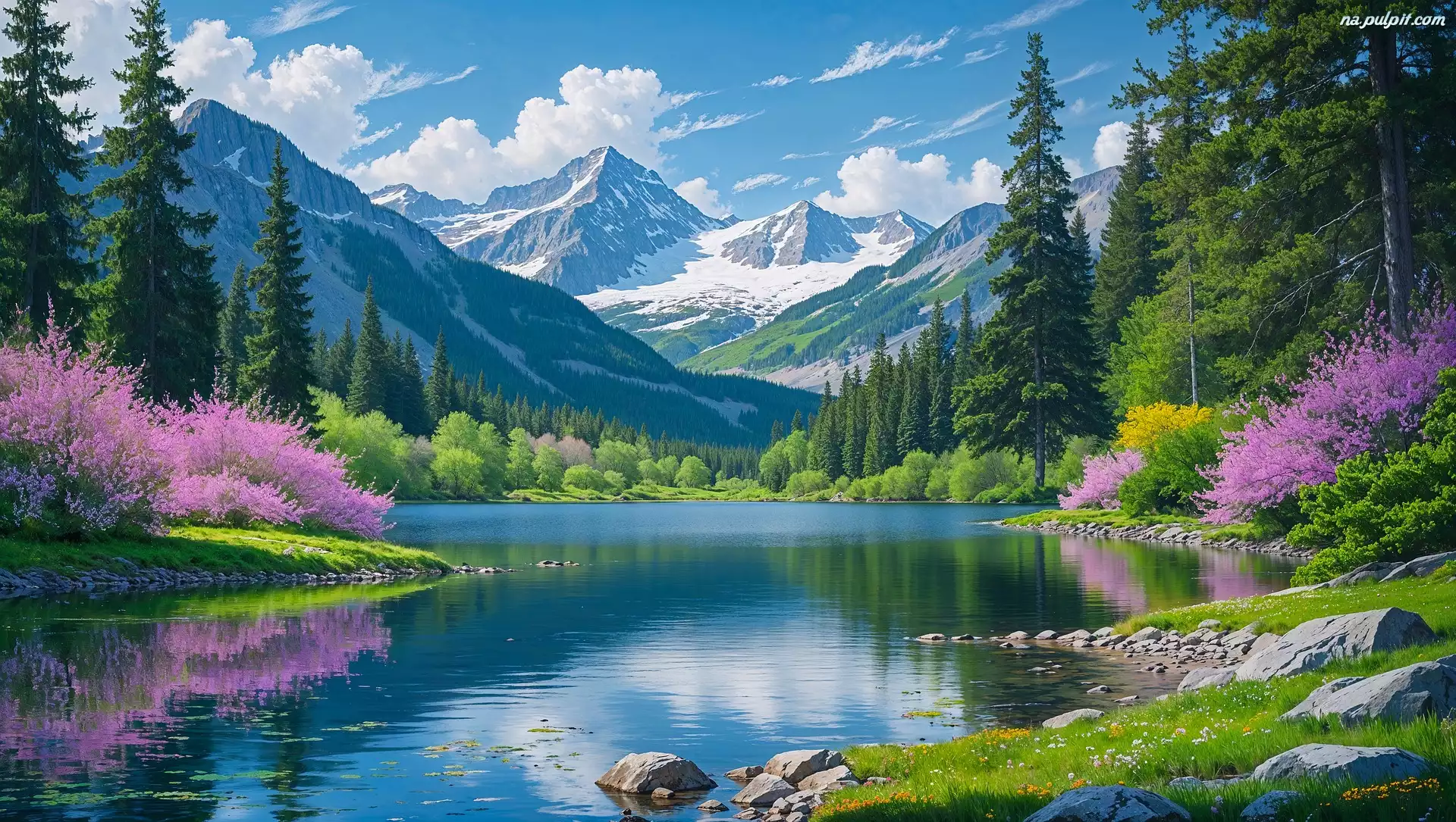Grafika, Jezioro, Krzewy, Wiosna, Drzewa, Kwitnące, Góry Na Pulpit