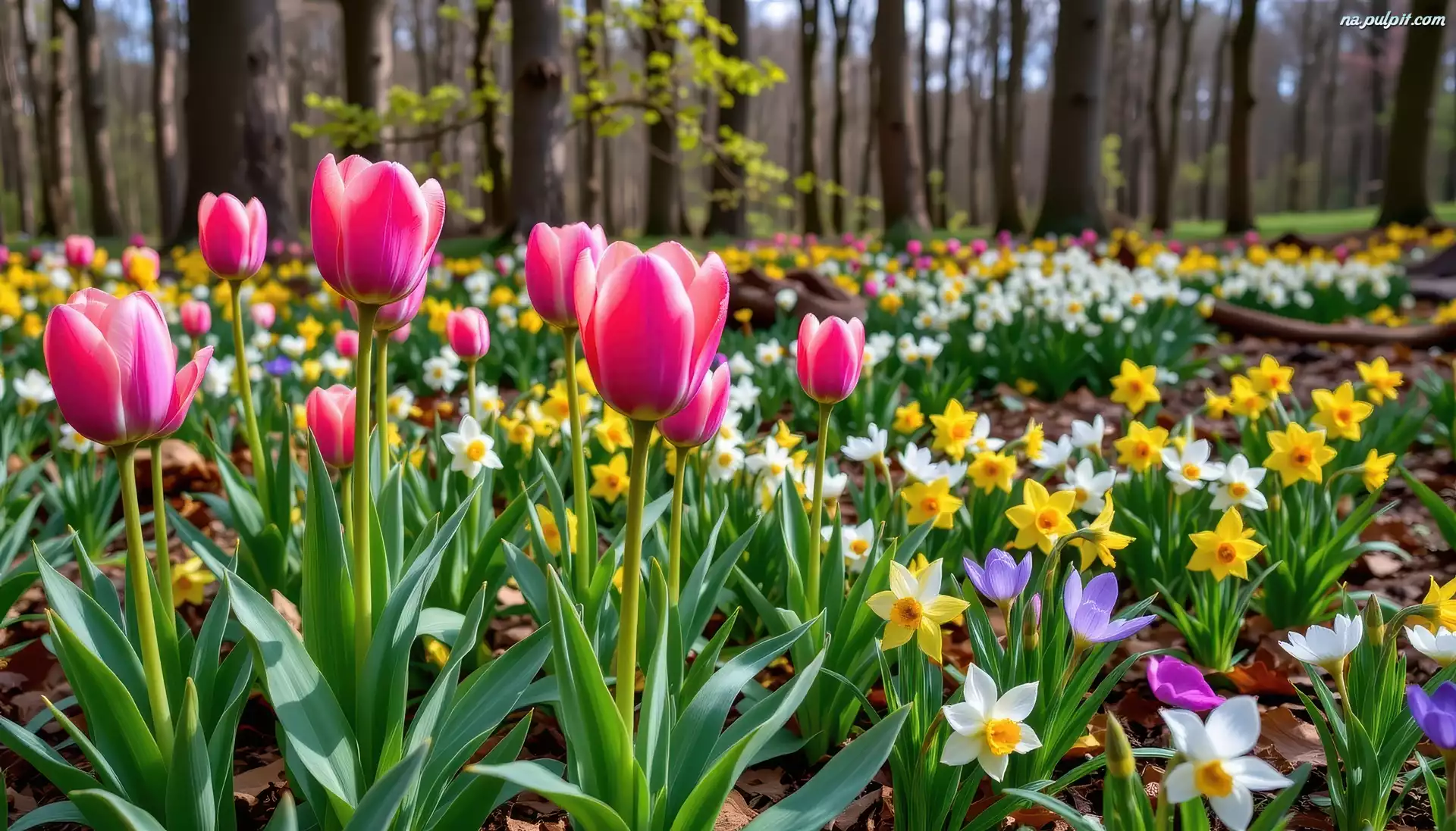 Las, Tulipany, Kwiaty, Wiosna, Żonkile, Grafika AI Na Pulpit