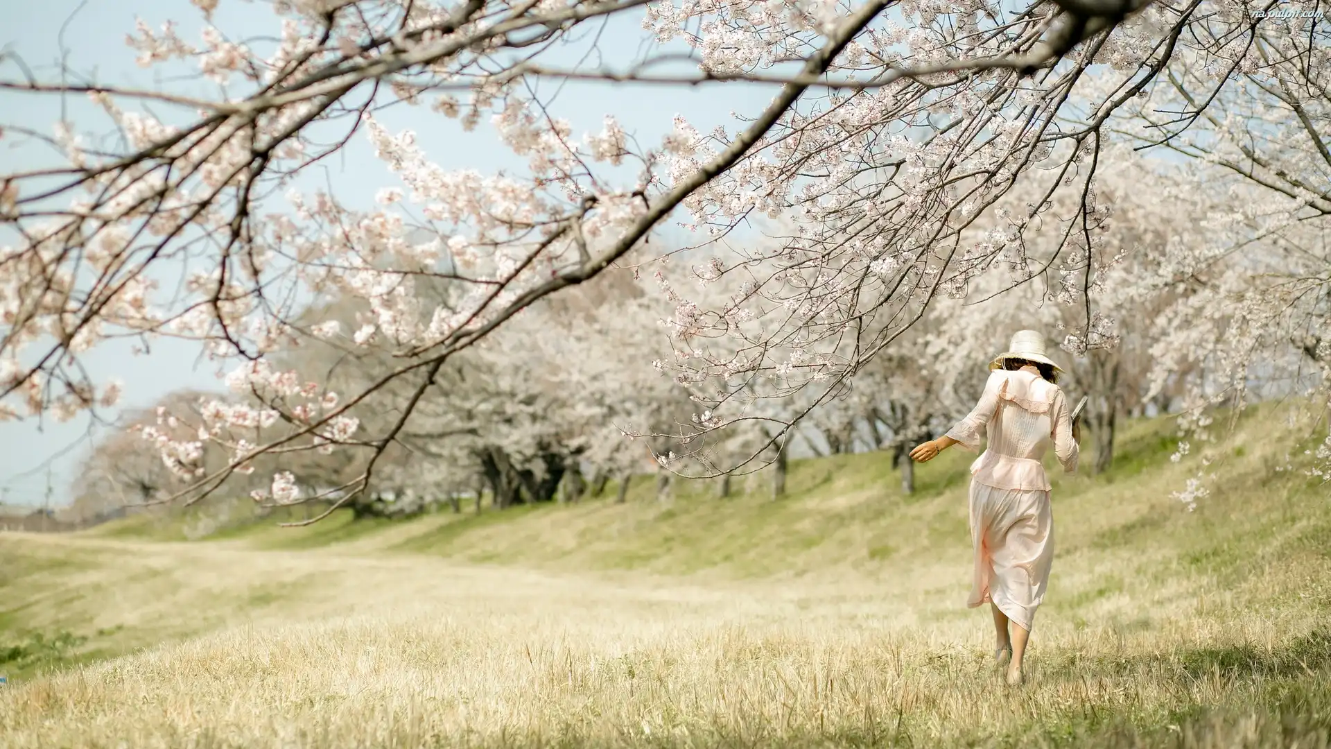 Spacer, Wiosna, Kapelusz, Drzewa, Kwitnące, Park, Kobieta