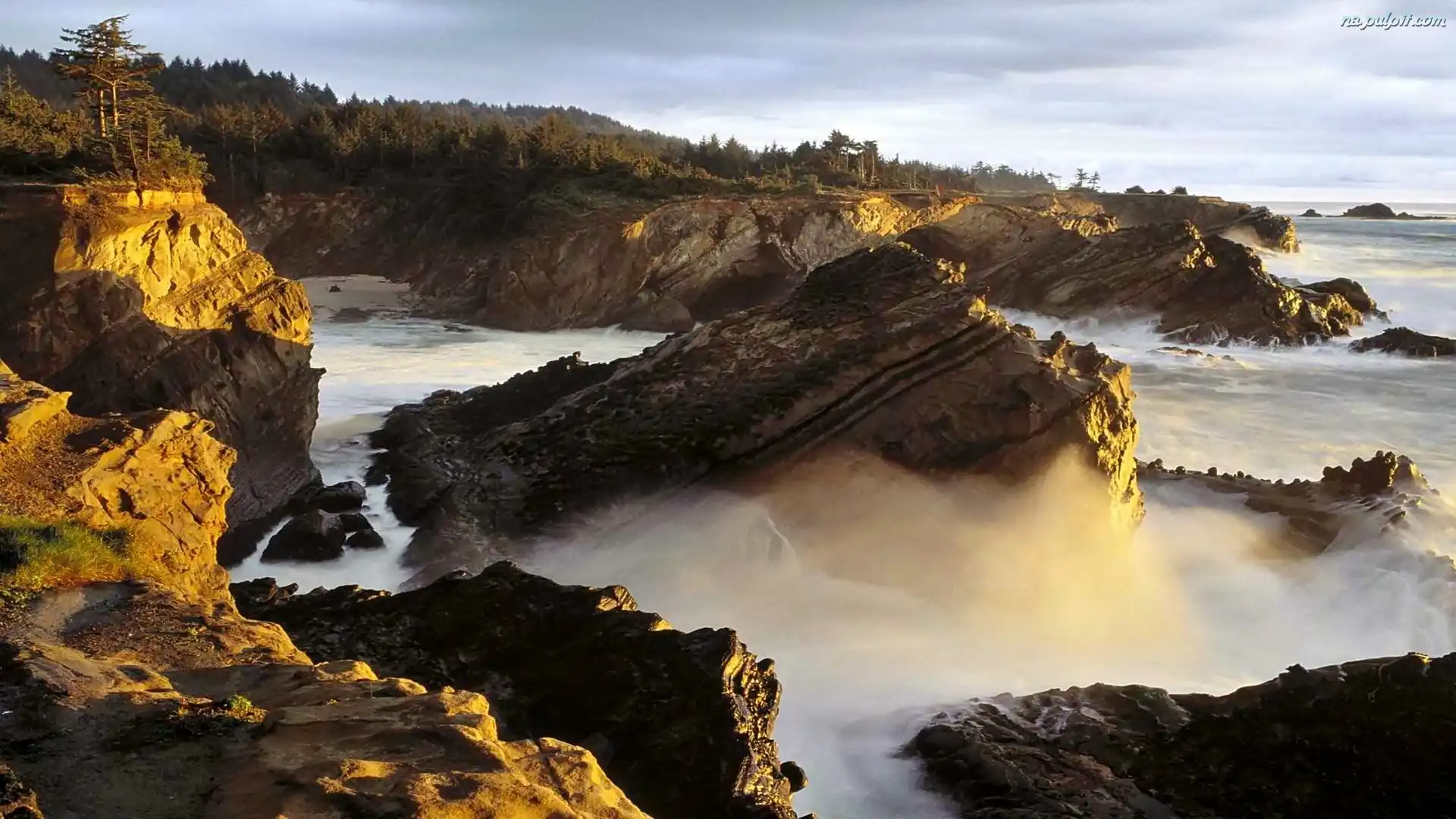 Świt, Las, Skały, Morze, Oregon, Wybrzeże Na Pulpit