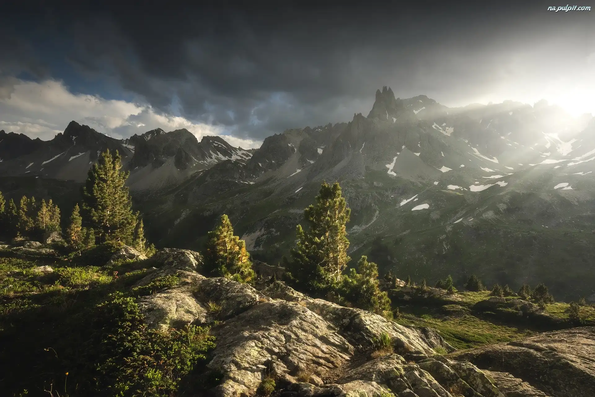 Skały, Świt, Wschód słońca, Drzewa, Góry, Świerki Na Pulpit
