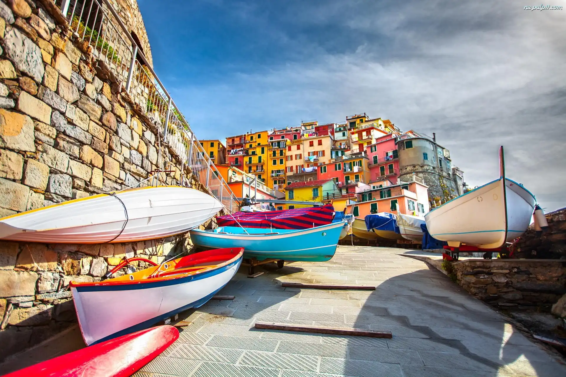 Domy, Włochy, Wybrzeże Liguryjskie, Osada, Łódki, Manarola