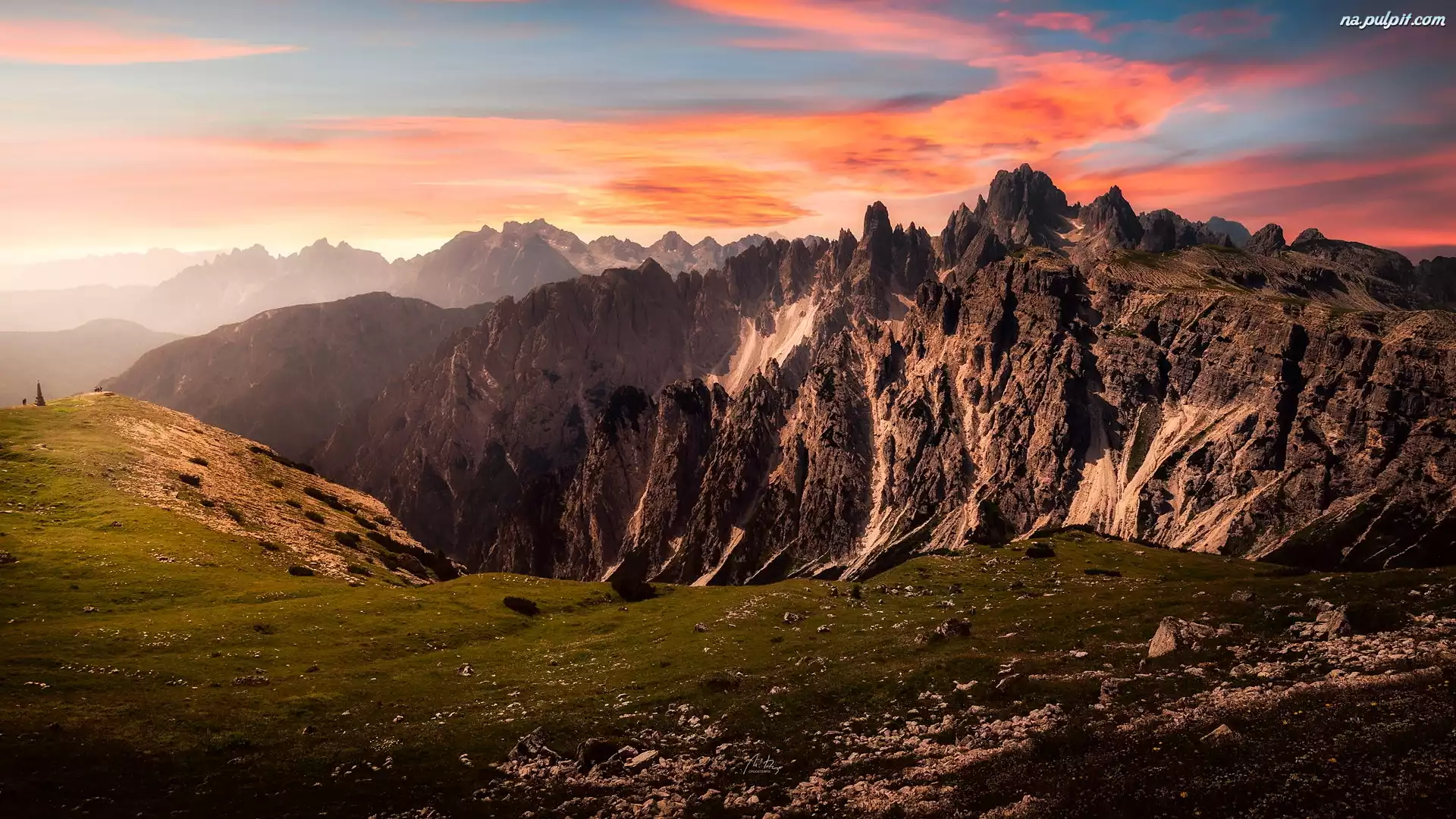 Włochy, Dolomity, Góry, Wschód słońca Na Pulpit
