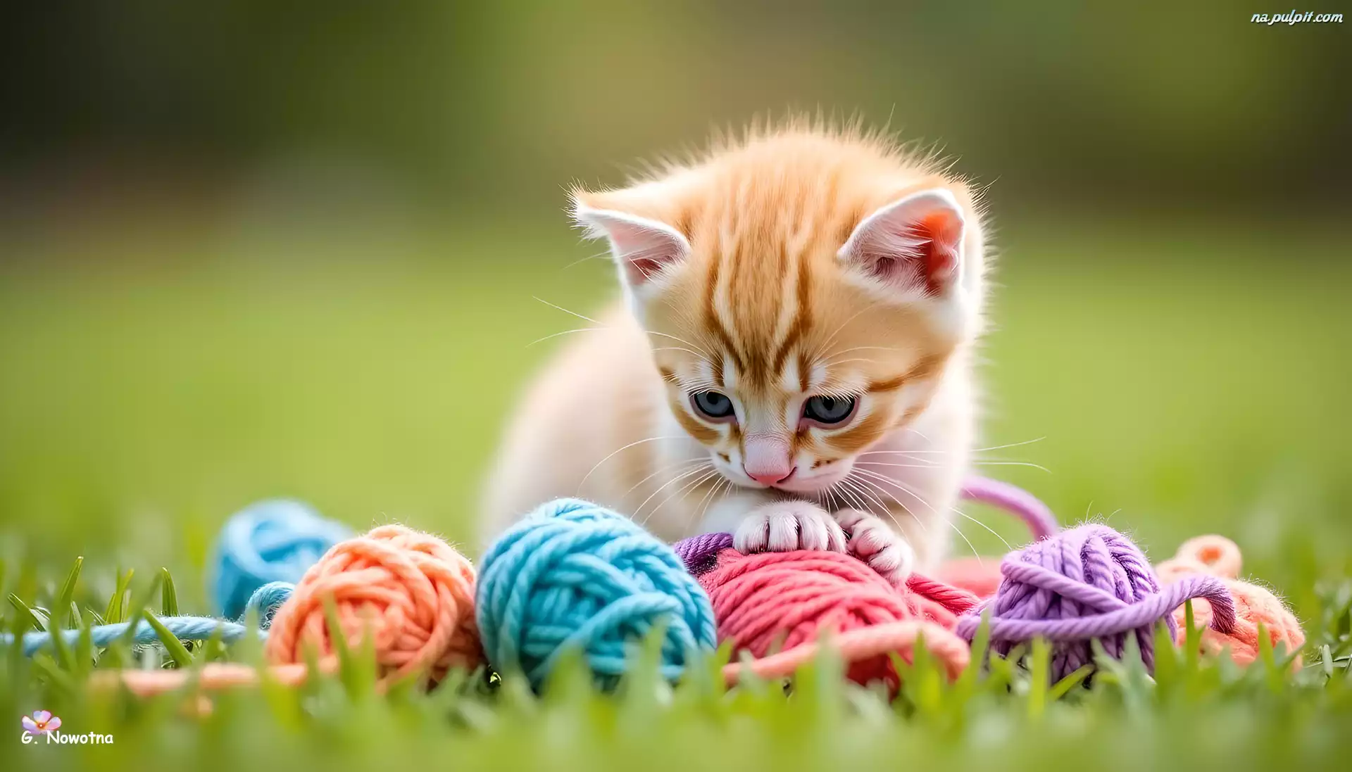 Kot, Włóczka, Trawa, Grafika AI Na Pulpit