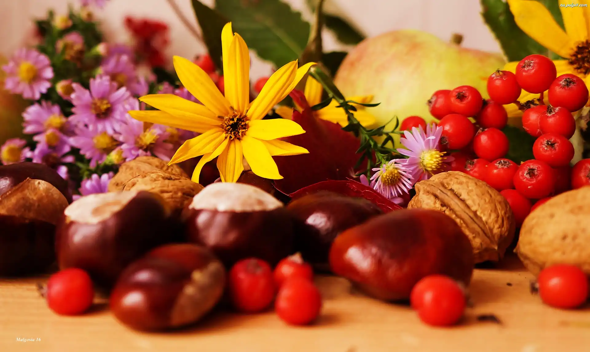 Astry, Jesień, Słonecznik Ozdobny, Jarzębina, Kasztany, Kompozycja, Orzechy Włoskie