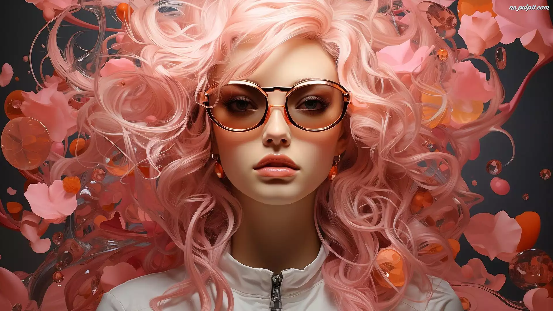 Okulary, Kobieta, Długie, Włosy, Różowe, Grafika