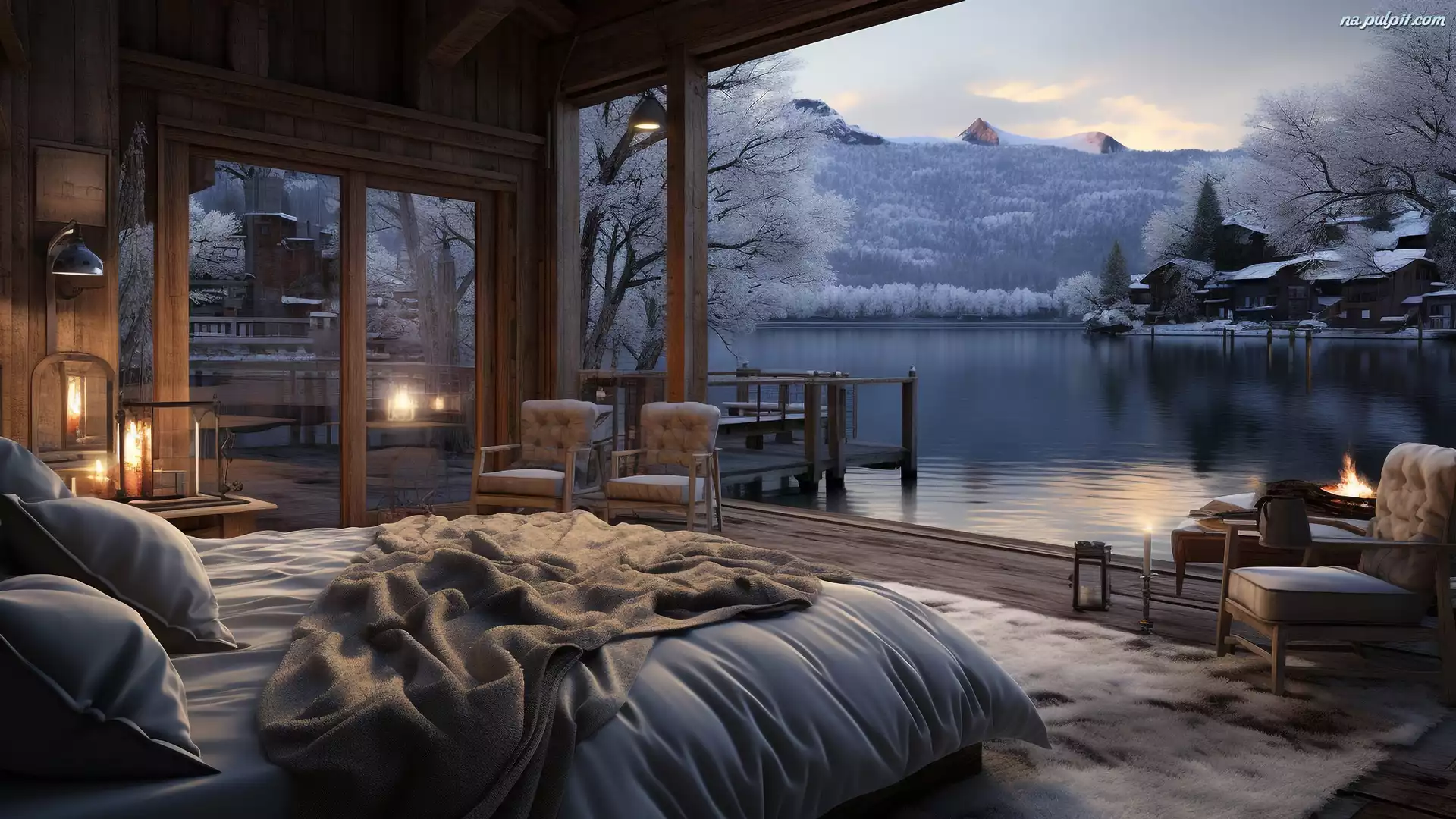 Zima, Wnętrze, Sypialnia, Grafika, Jezioro Na Pulpit