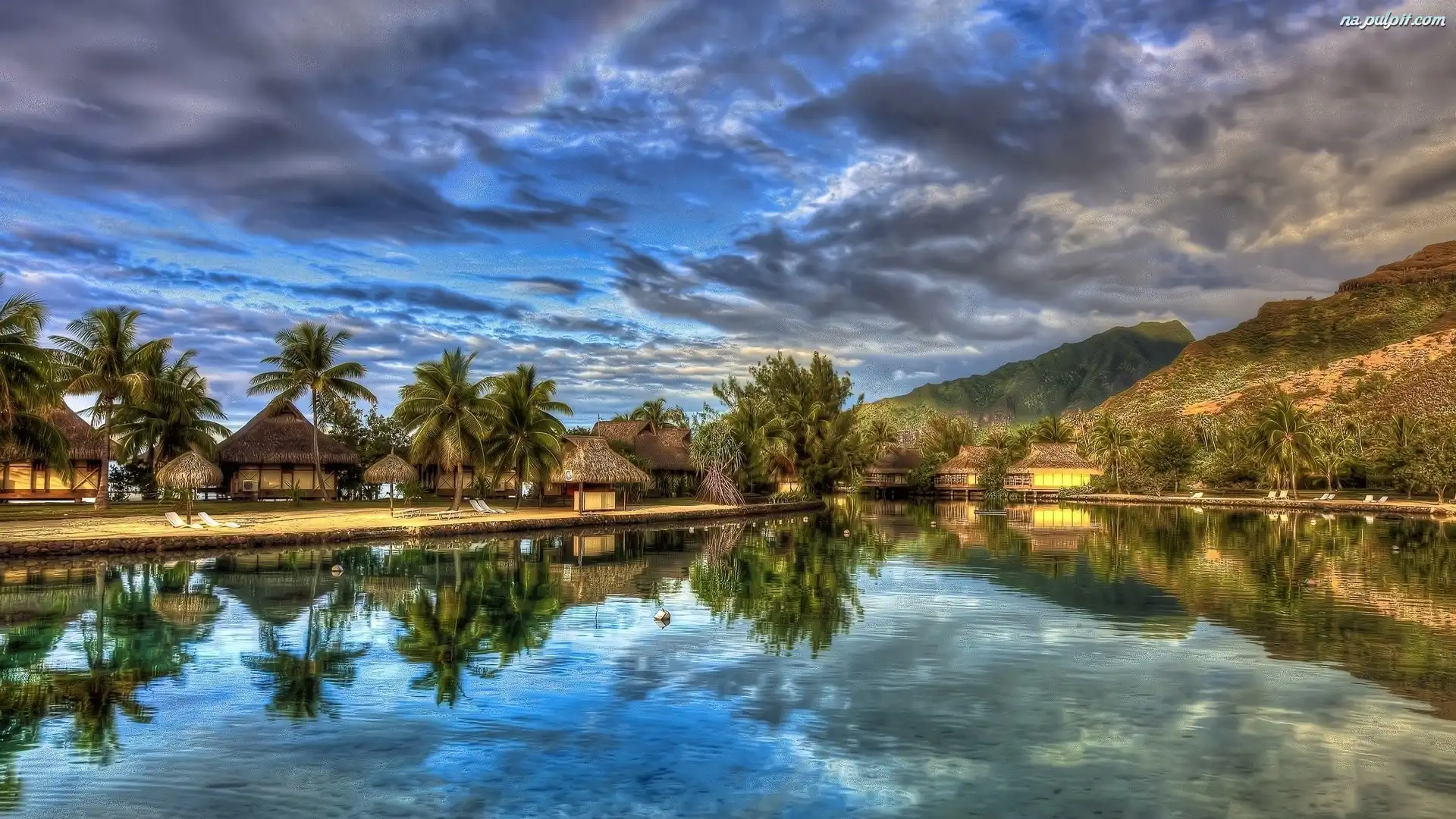 Woda, Palmy, Góry, Chmury, Domki Na Pulpit