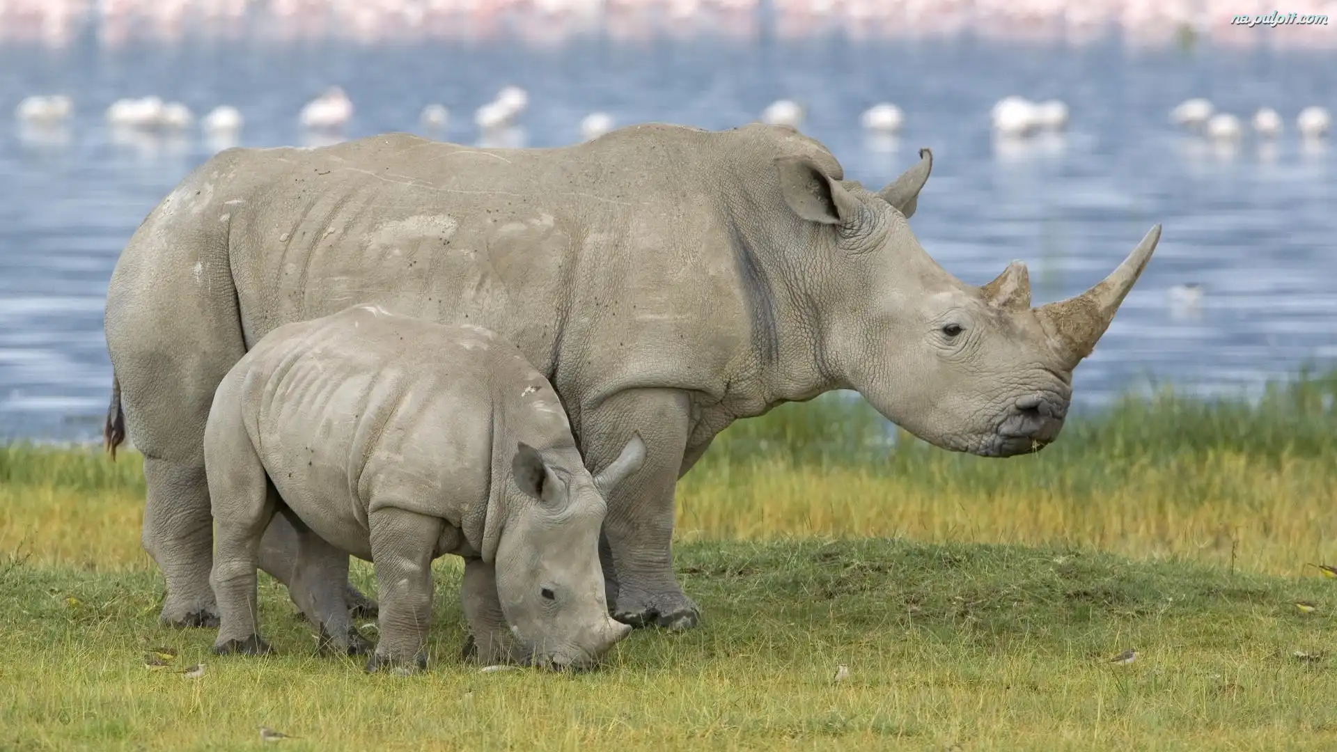 Woda, Nosorożce, Dwa, Trawa Na Pulpit
