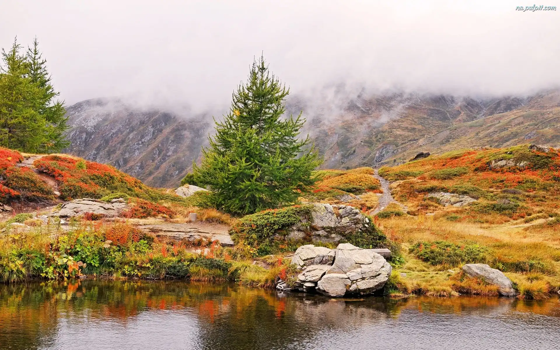 Woda, Drzewa, Góry, Mgła Na Pulpit