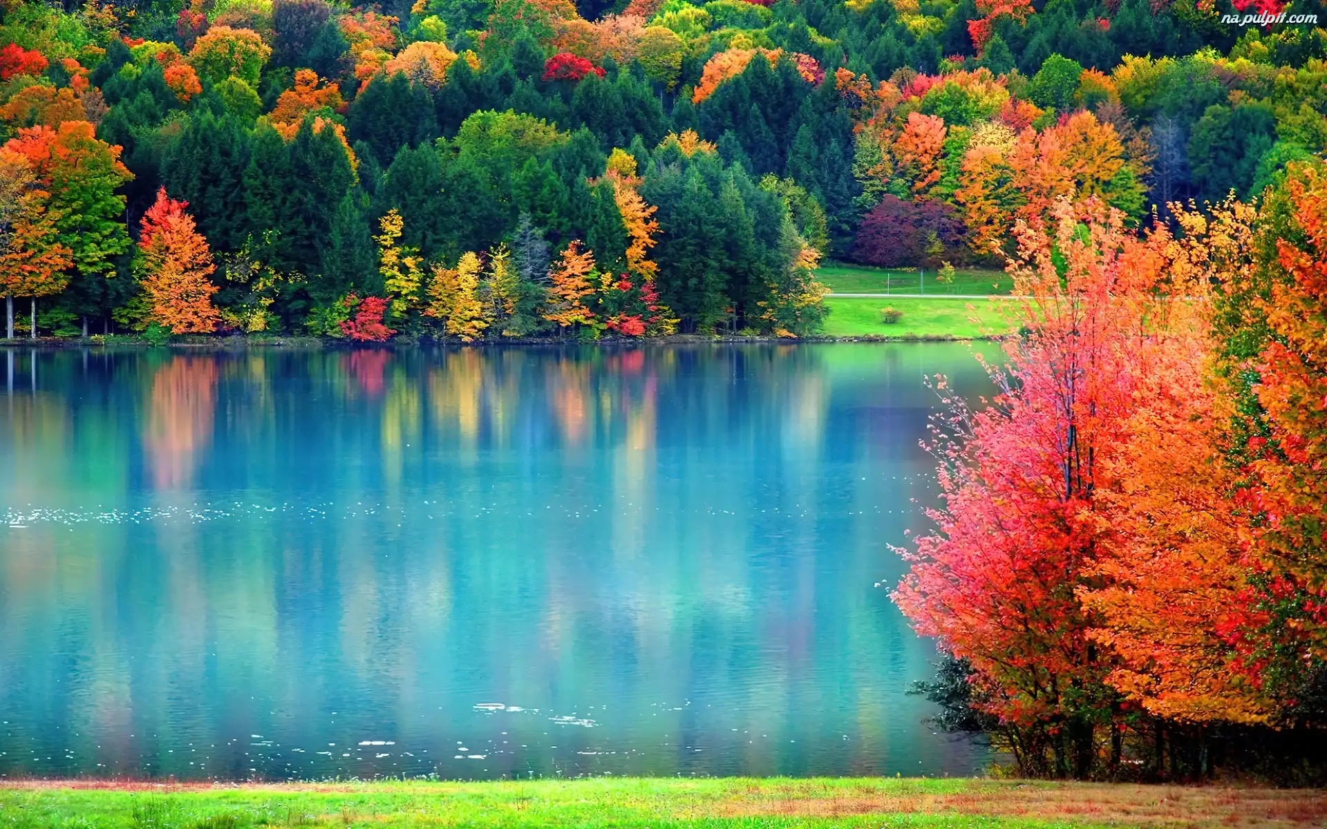 Woda, Liście, Kolorowe, Las, Jesień, Odbicie Na Pulpit