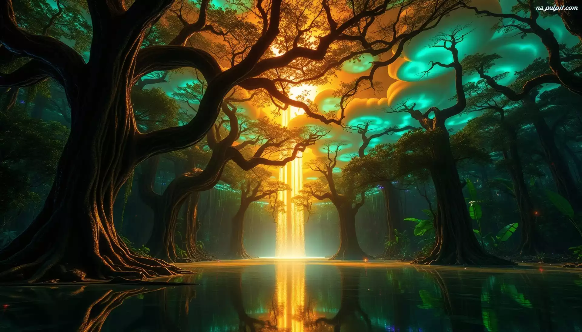 Woda, Fantasy, Sceniczny, Natura, Drzewa, Przyroda, Krajobraz, Odbicia, Światło