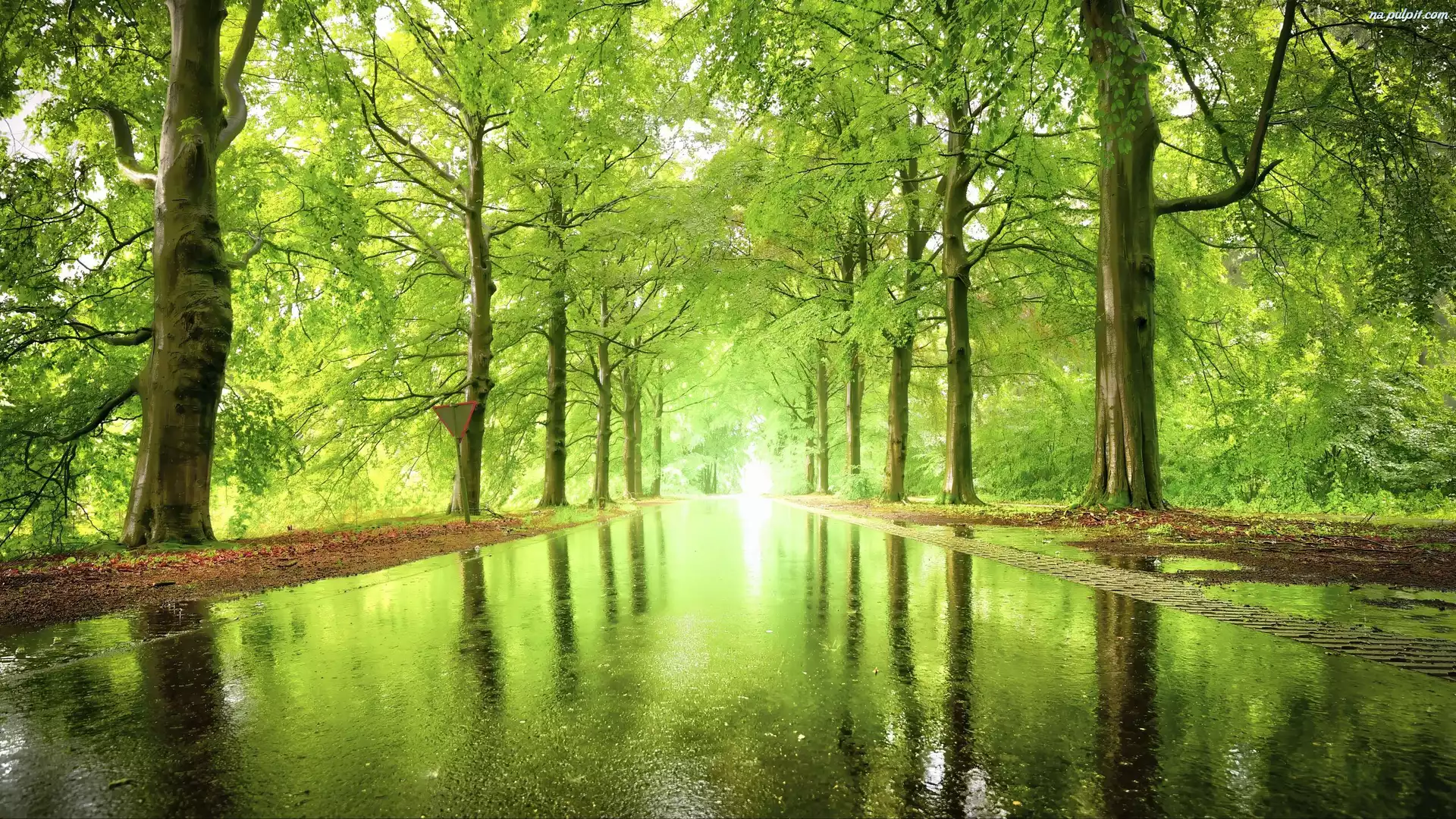 Droga, Aleja, Światło, Woda, Drzewa, Mokro Na Pulpit