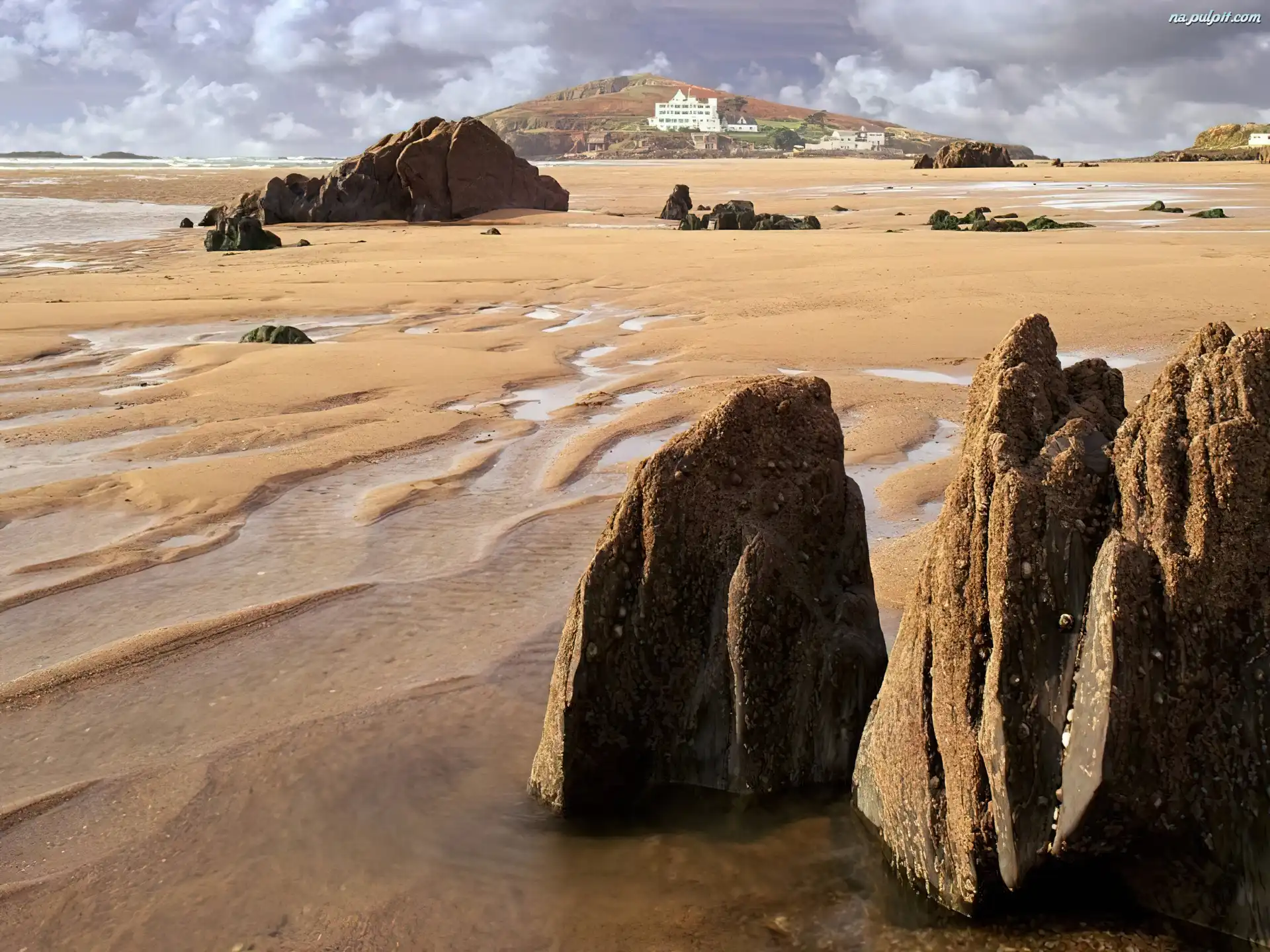 Woda, Budynki, Skały, Piasek Na Pulpit