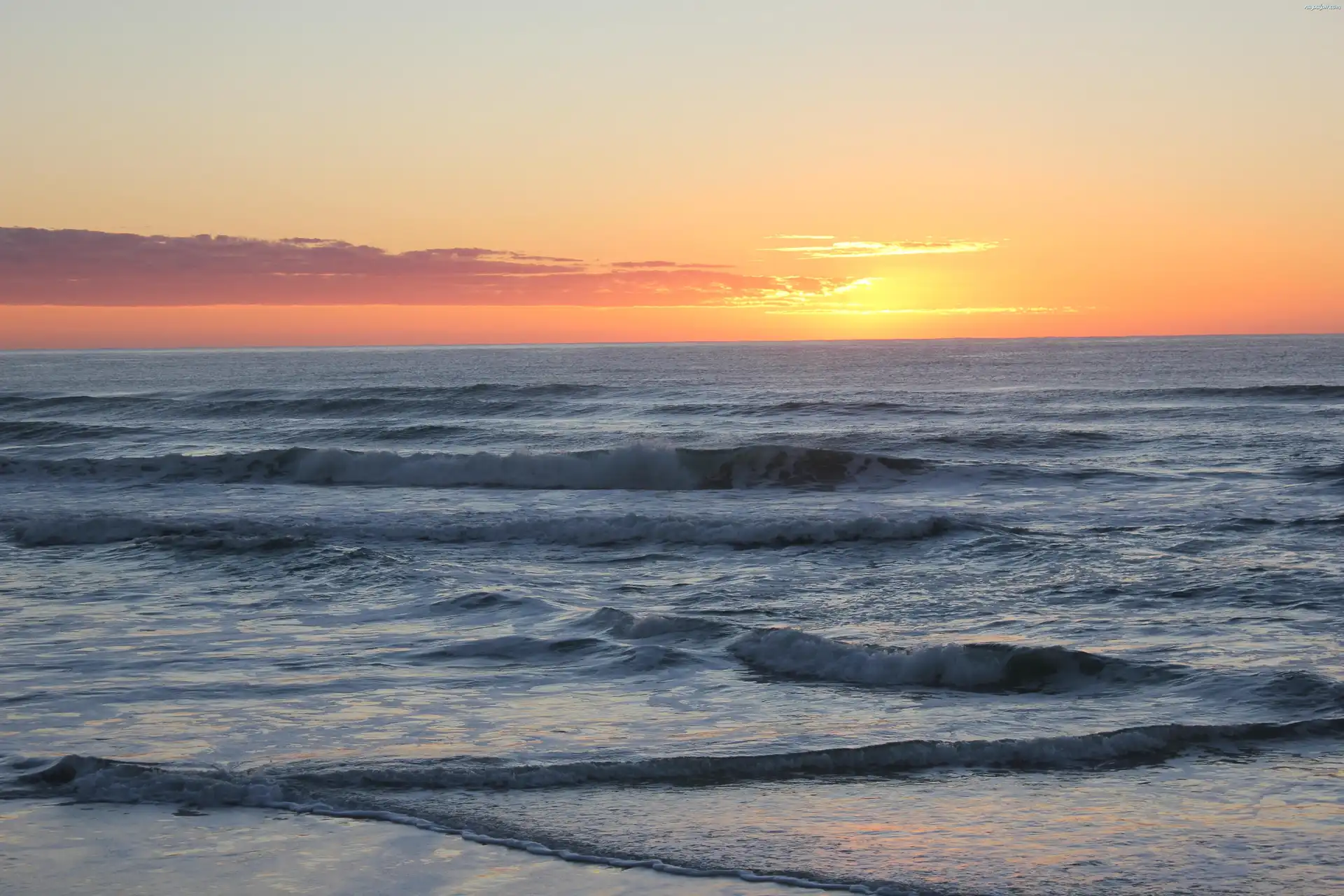 Woda, Morze, Zachód Słońca, Fale