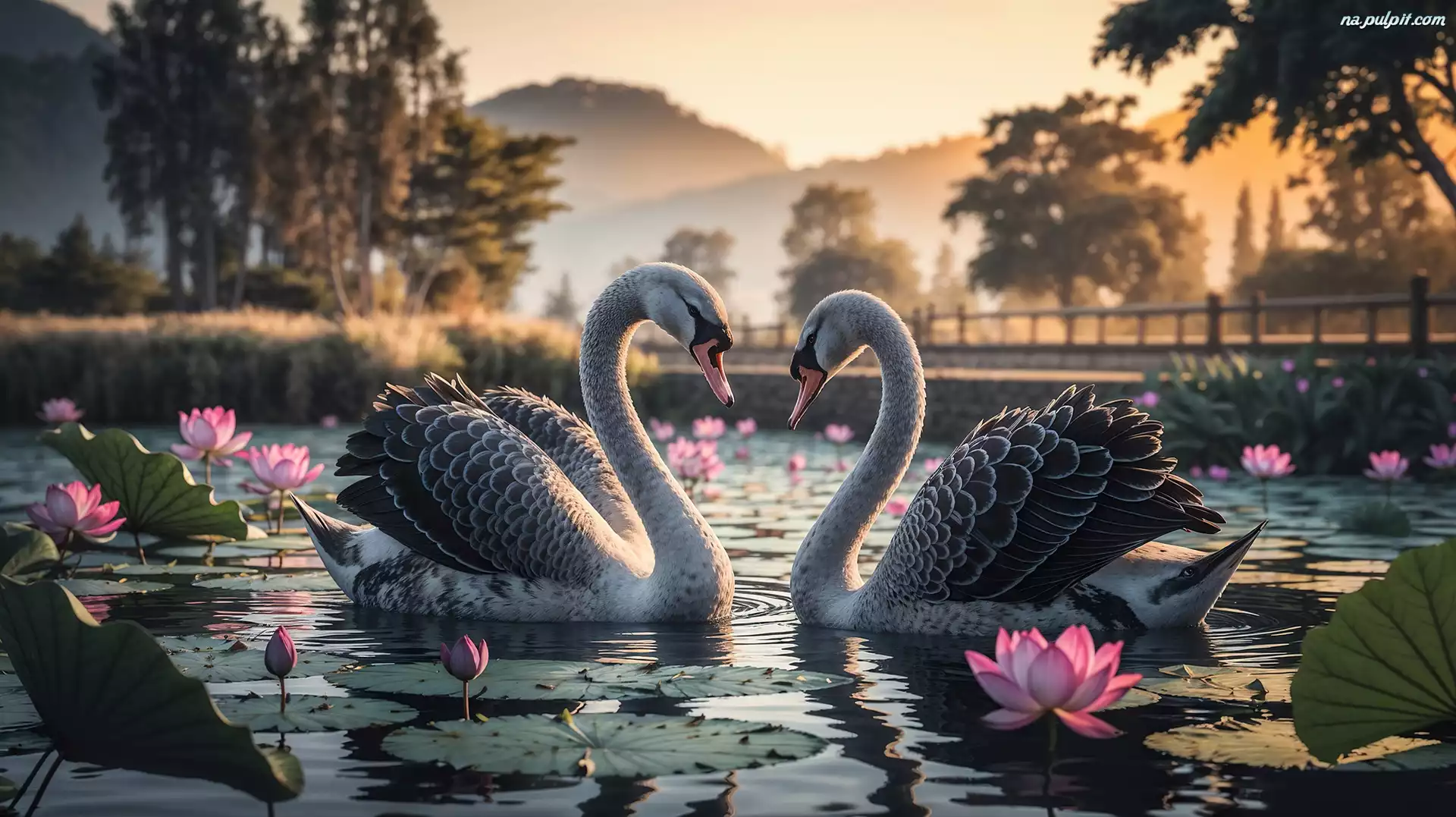 Łabędzie, Staw, Lilie wodne, Grafika AI Na Pulpit