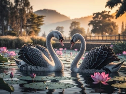 Łabędzie, Staw, Lilie wodne, Grafika AI
