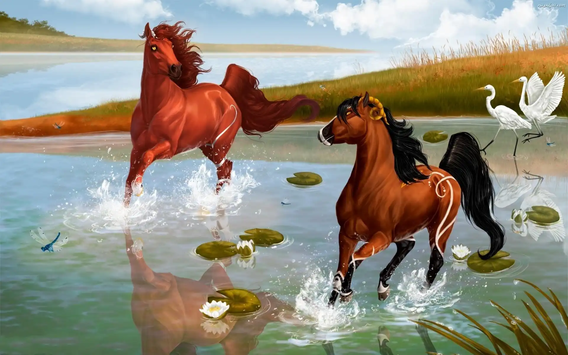 Wodne, Woda, Konie, Lilie Na Pulpit