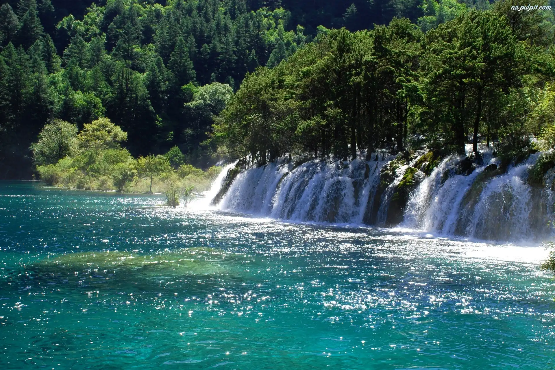Wodospad, Słoneczny, Dzień, Drzewa, Chiny, Rzeka