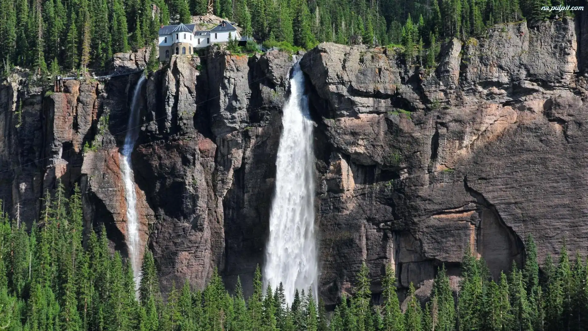 Wodospad, Skały, Dom, Drzewa Na Pulpit