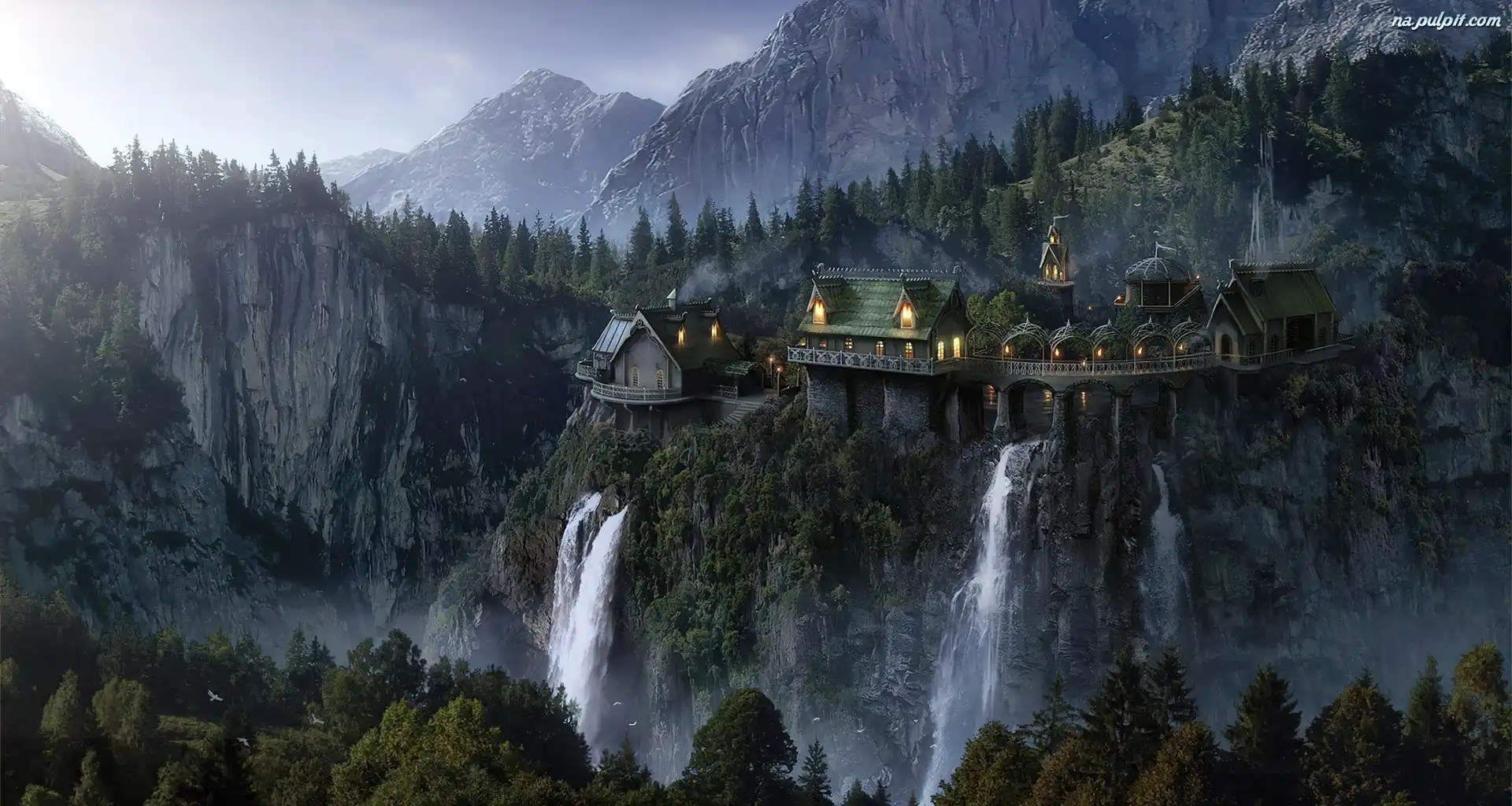 Wodospad, Góry, Wysokie, Domy, Lasy Na Pulpit