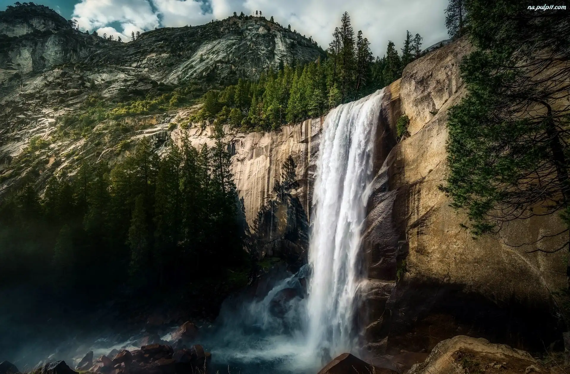 Wodospad, Drzewa, Góry, Kamienie Na Pulpit