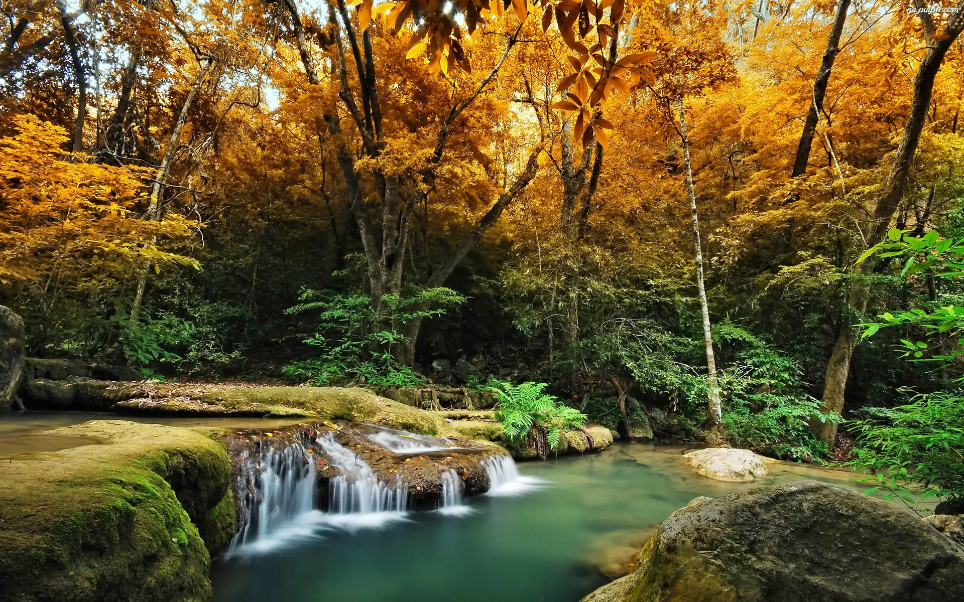 Wodospad, Drzewa, Jesień, Mały