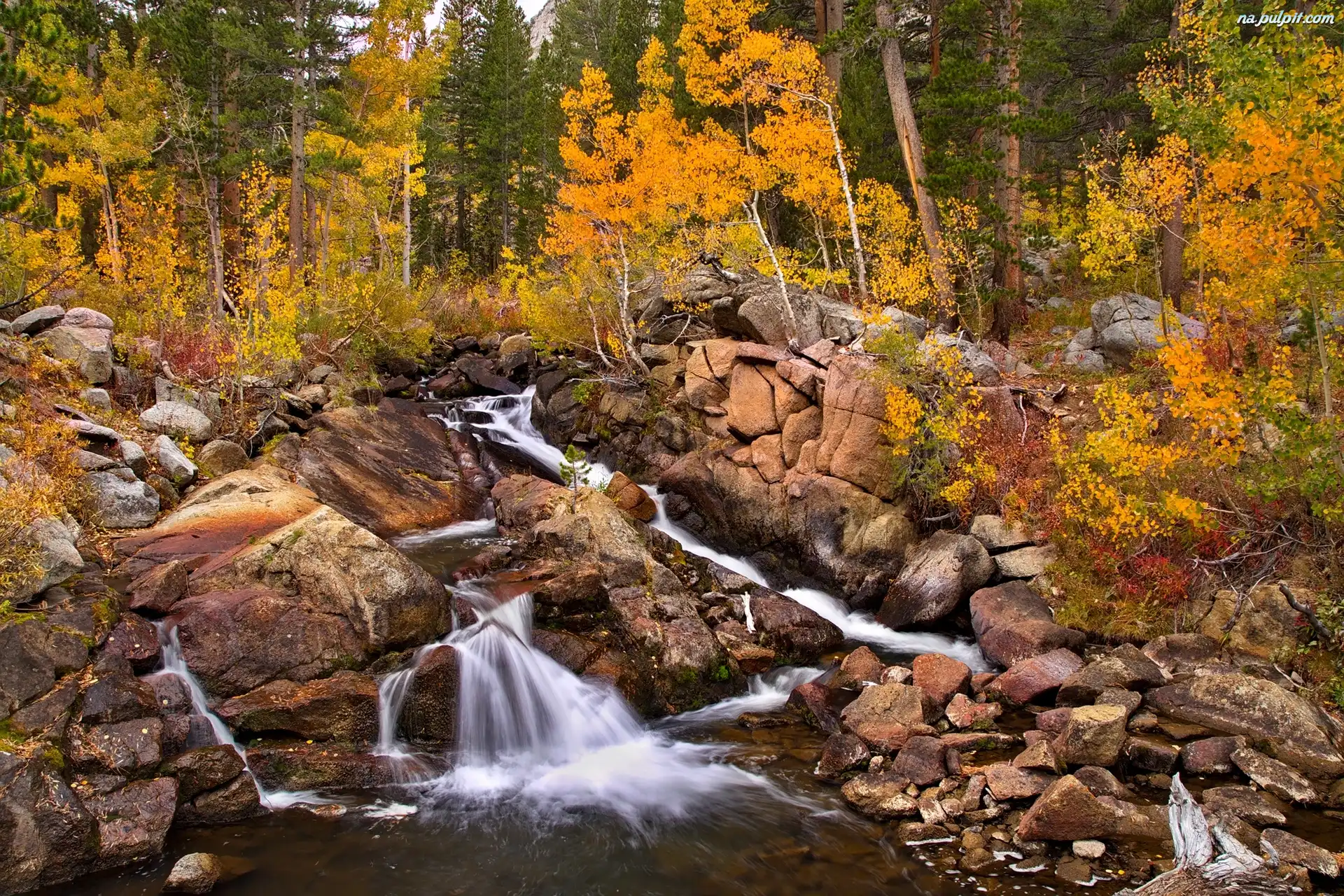Drzew, Jesienne, Kolory Wodospad żółte Liście, Jesień, Drzewo Jesień, Las Skał, Wodospad, Wśród Rzeki, Las Dno, Czysta, Jezioro, Woda Wodospad Jesień Niebo, Chmura, Góry, Las wonski Wodospad Góry, Uboga, Roślinność Drzewa, Strumień, Kamienie Las, Kwiatki Kamienie, Góra, Niebo