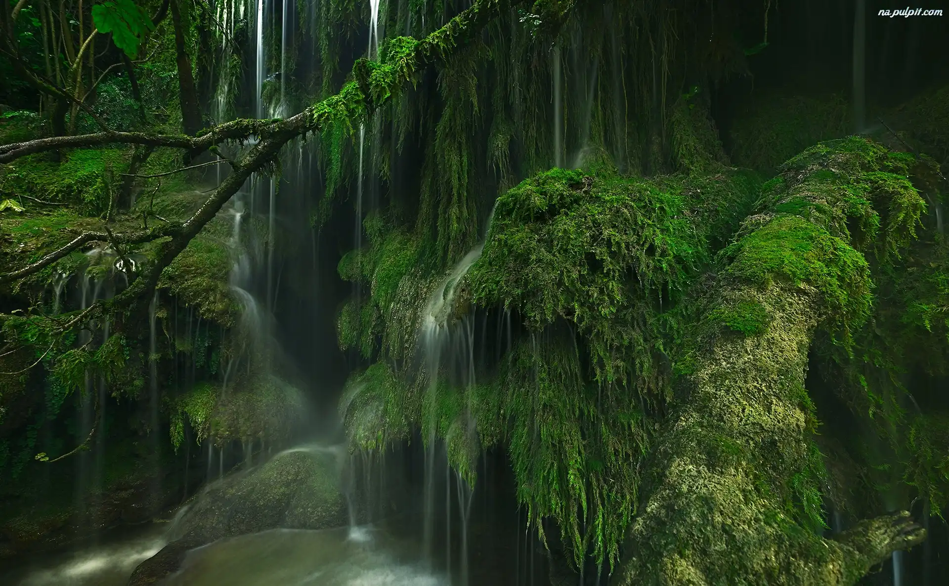 Wodospad, Skały, Mech, Drzewo, Las, Gałąź Na Pulpit