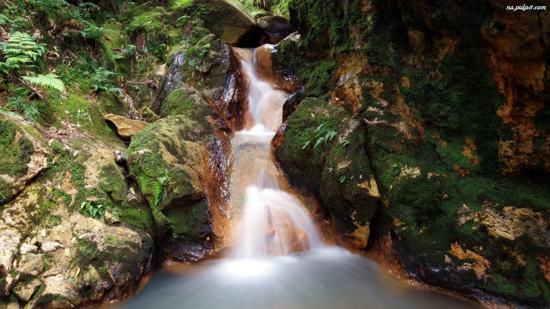 Wodospad, Mchy, Skały, Paprocie Na Pulpit
