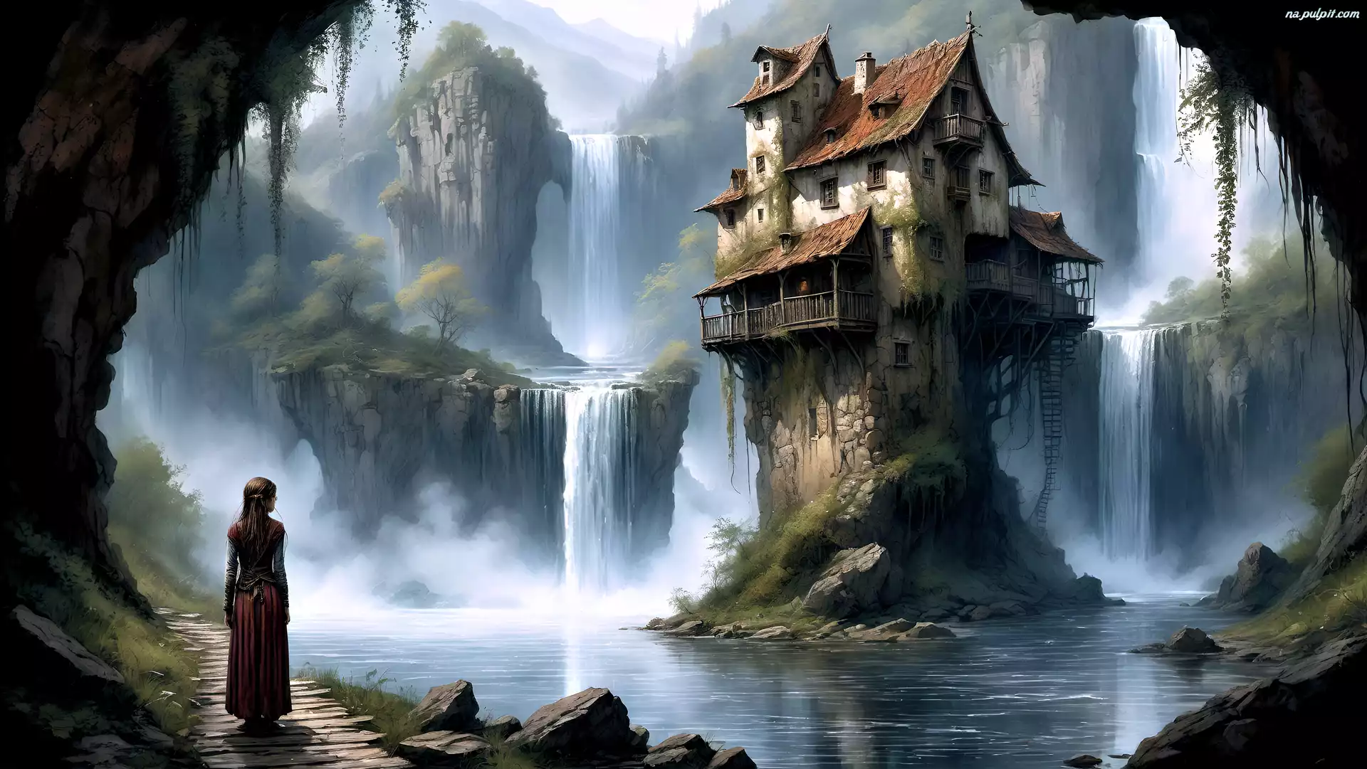 Kamienie, Skały, Kobieta, Wodospady, Dom, Fantasy