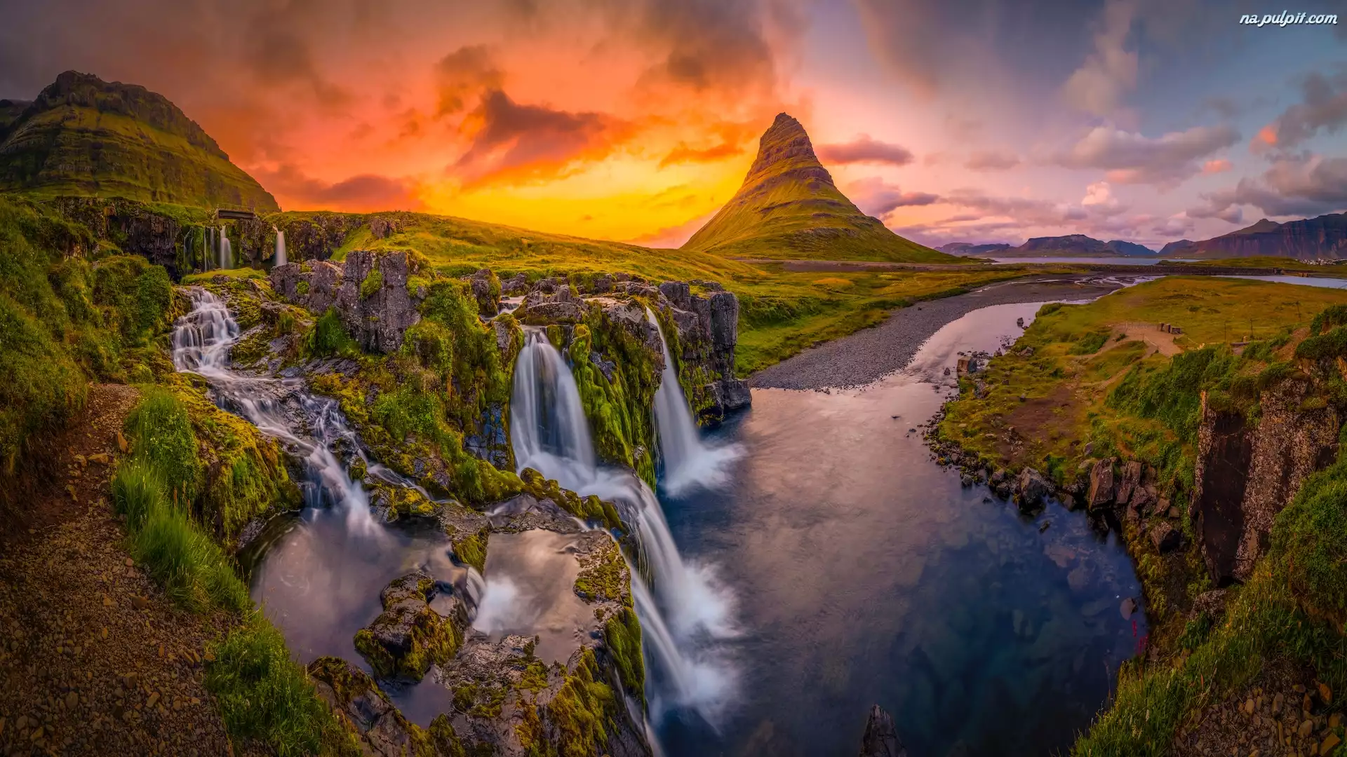 Wodospady, Islandia, Góra, Kirkjufell, Półwysep Snaefellsnes, Rzeka. Zachód słońca Na Pulpit