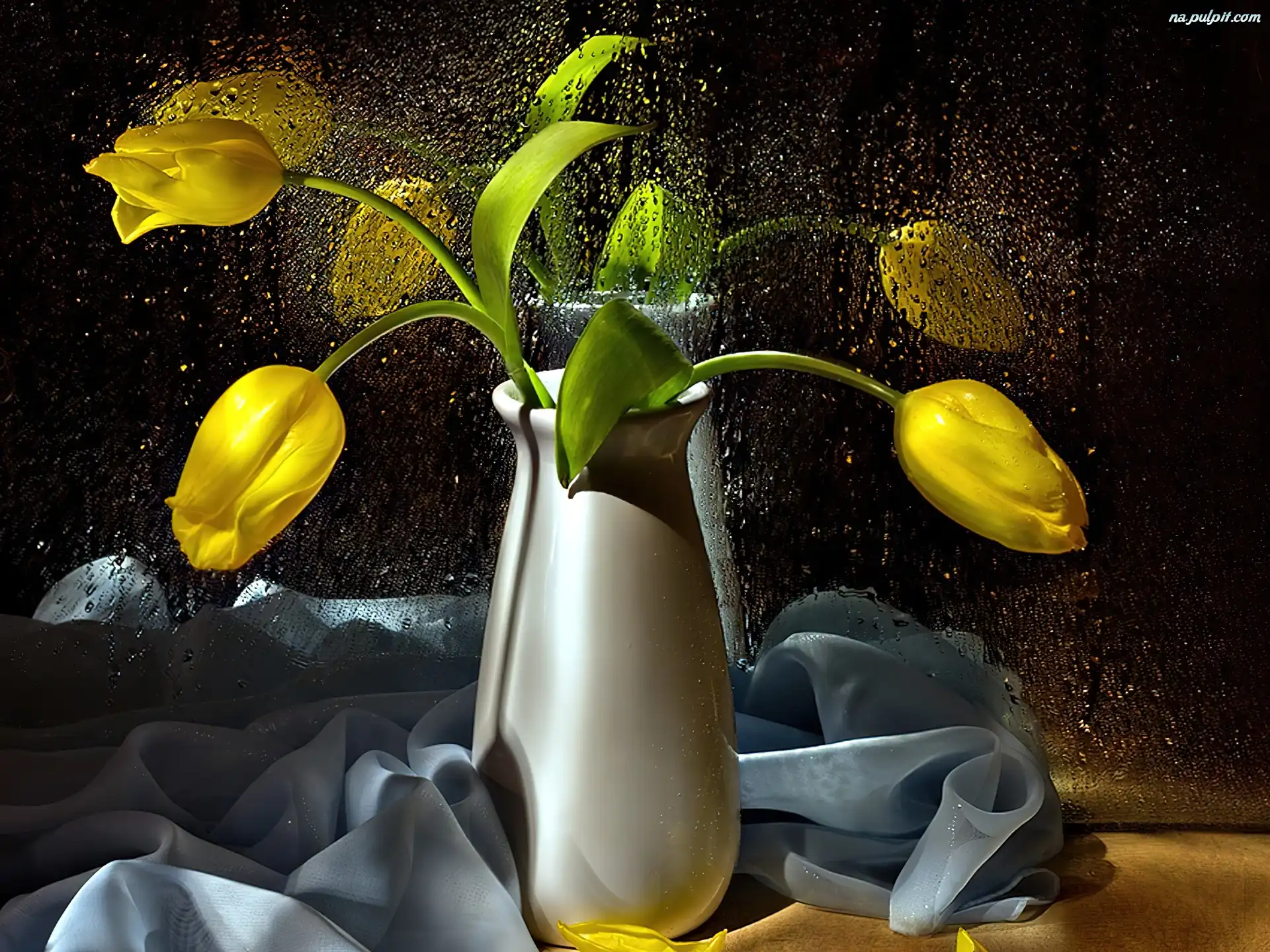 Wody, Tulipany, Żółte, Krople Na Pulpit
