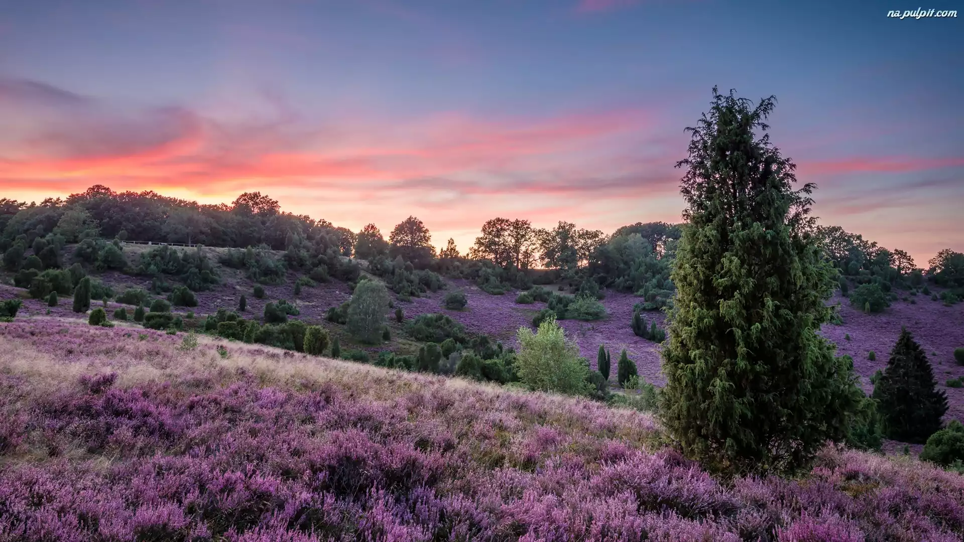 Wrzosowisko, Drzewa, Wrzosy, Wzgórza, Wschód słońca Na Pulpit