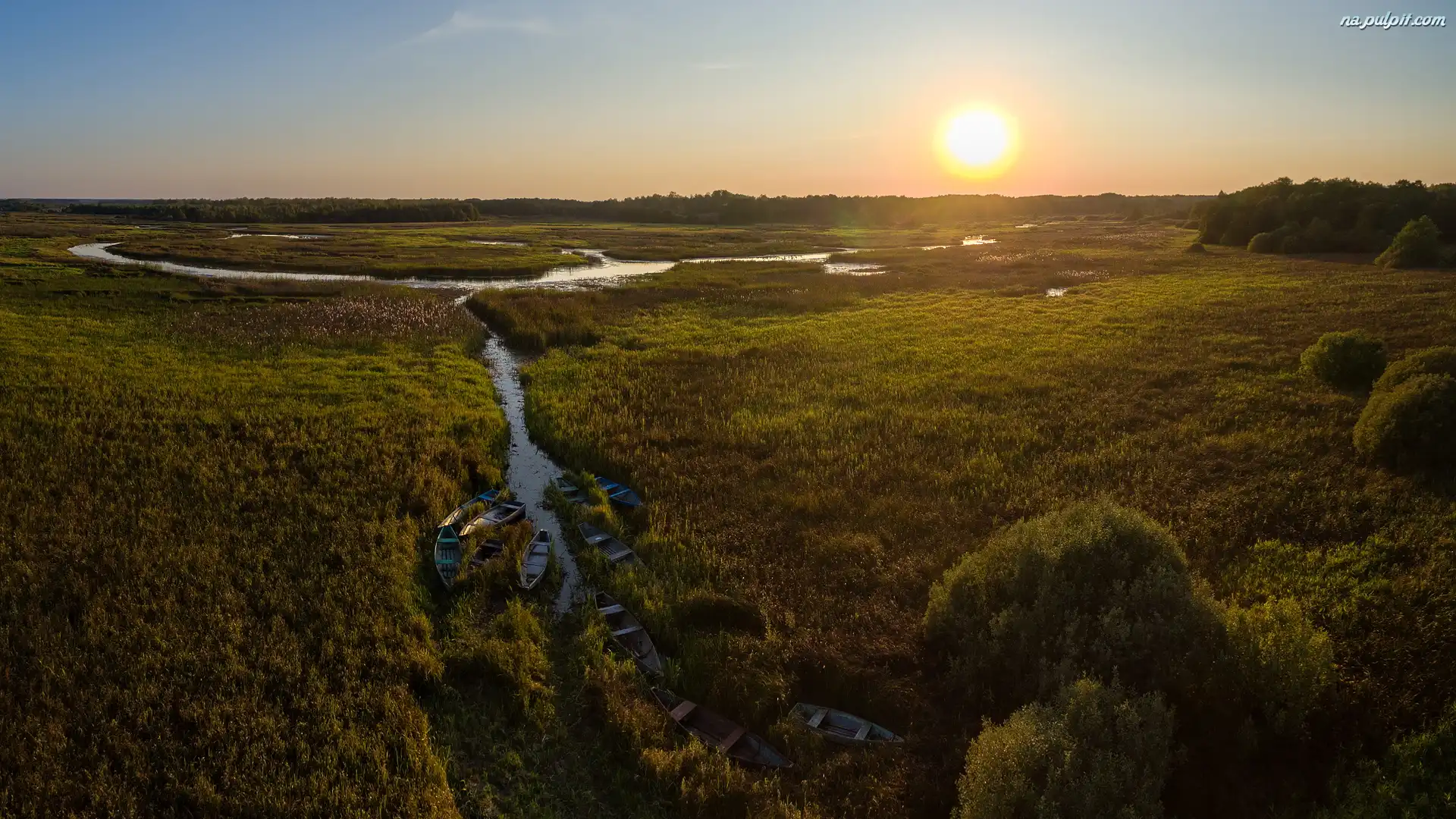 Wschód słońca, Rzeka, Drzewa, Łąki, Łódki