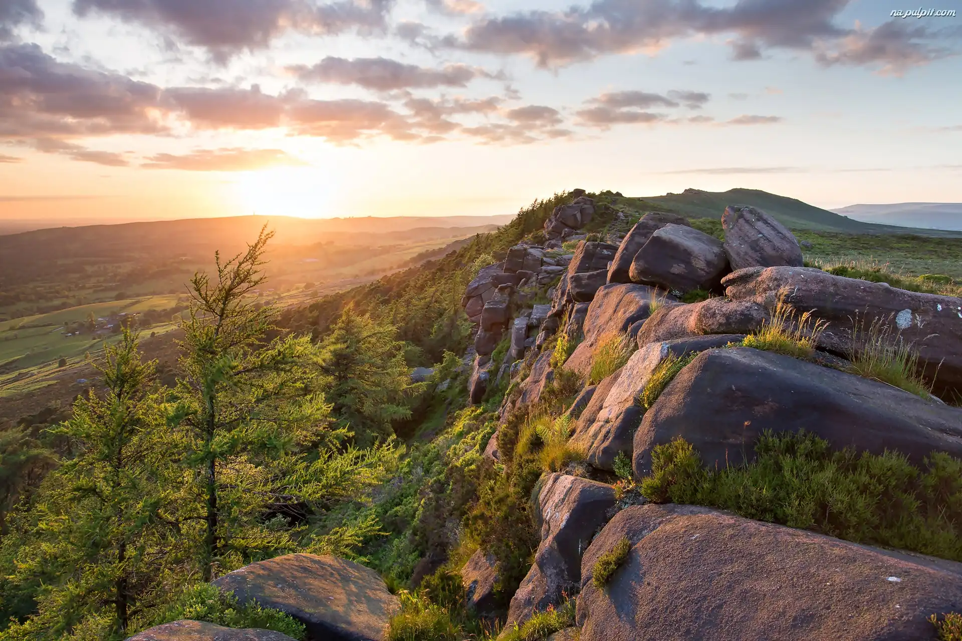 Wschód słońca, Hrabstwo Staffordshire, Skały, Grzbiet górski The Roaches, Park Narodowy Peak District, Anglia, Wzgórze Na Pulpit |