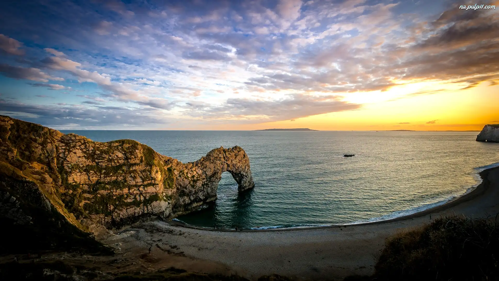 Wschód słońca, Hrabstwo Dorset, Wybrzeże Jurajskie, Łuk wapienny Durdle Door, Chmury, Skała, Kanał La Manche, Anglia, Morze Na Pulpit |
