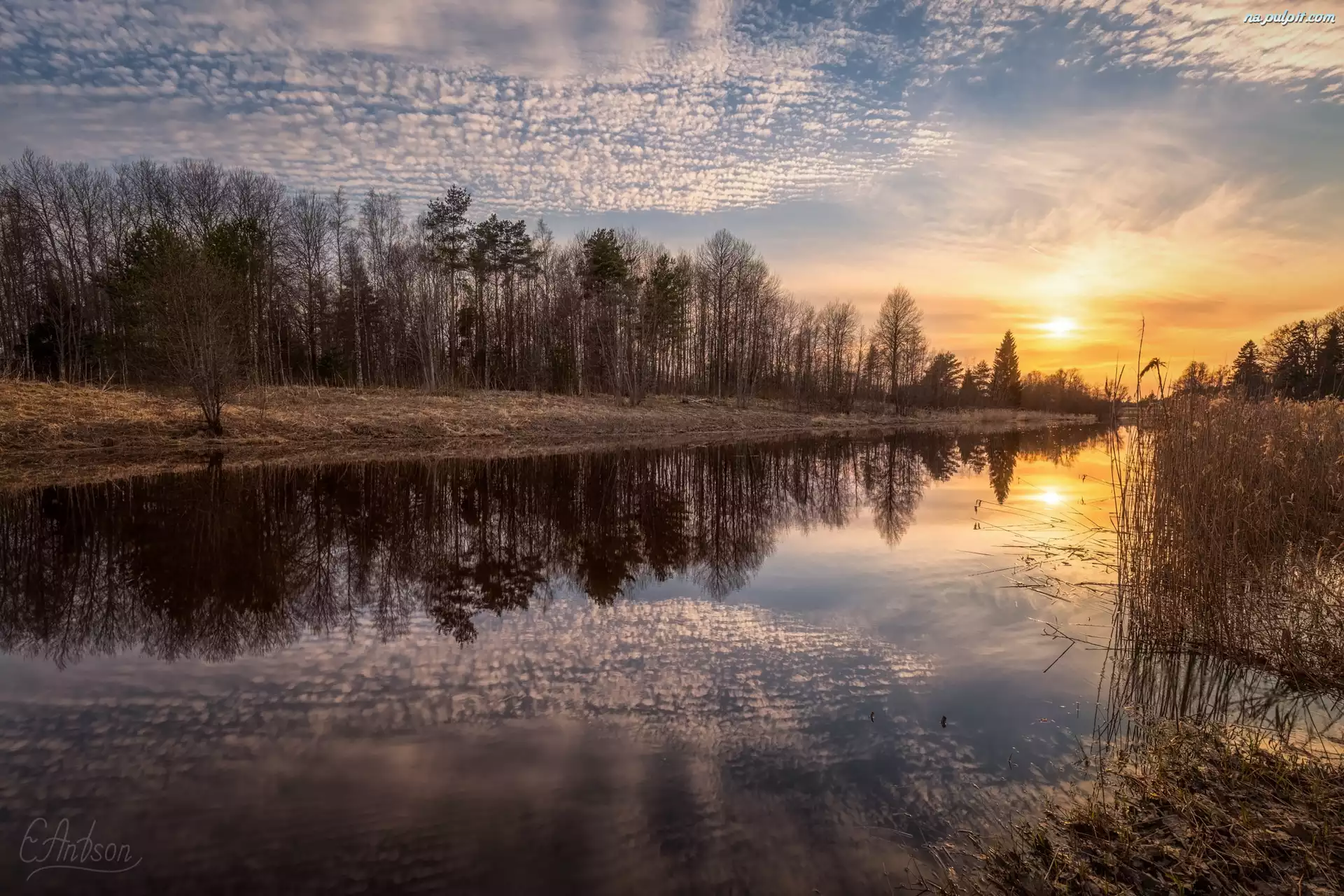 Drzewa, Wschód słońca, Odbicie, Szuwary, Rzeka, Chmury Na Pulpit