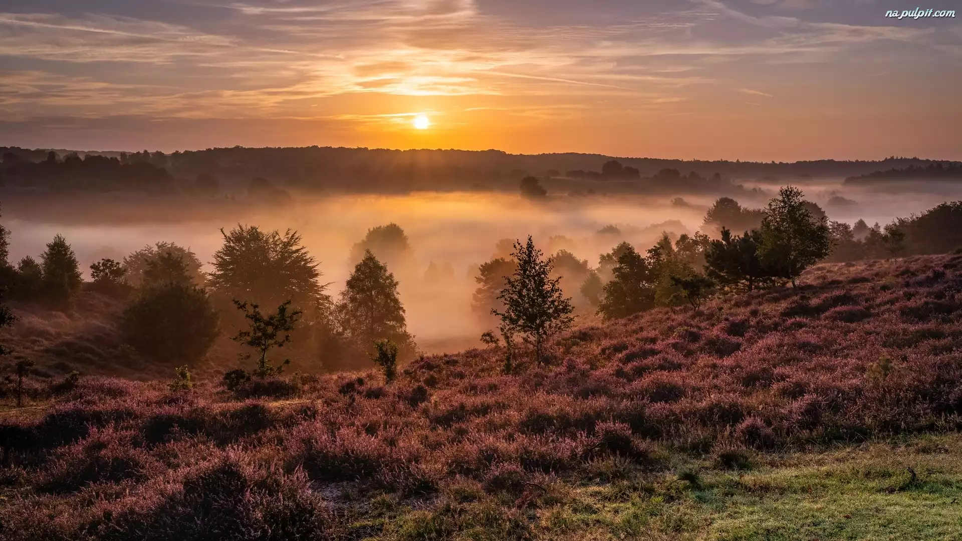 Mgła, Pole, Wrzosowisko, Wschód słońca, Drzewa Na Pulpit