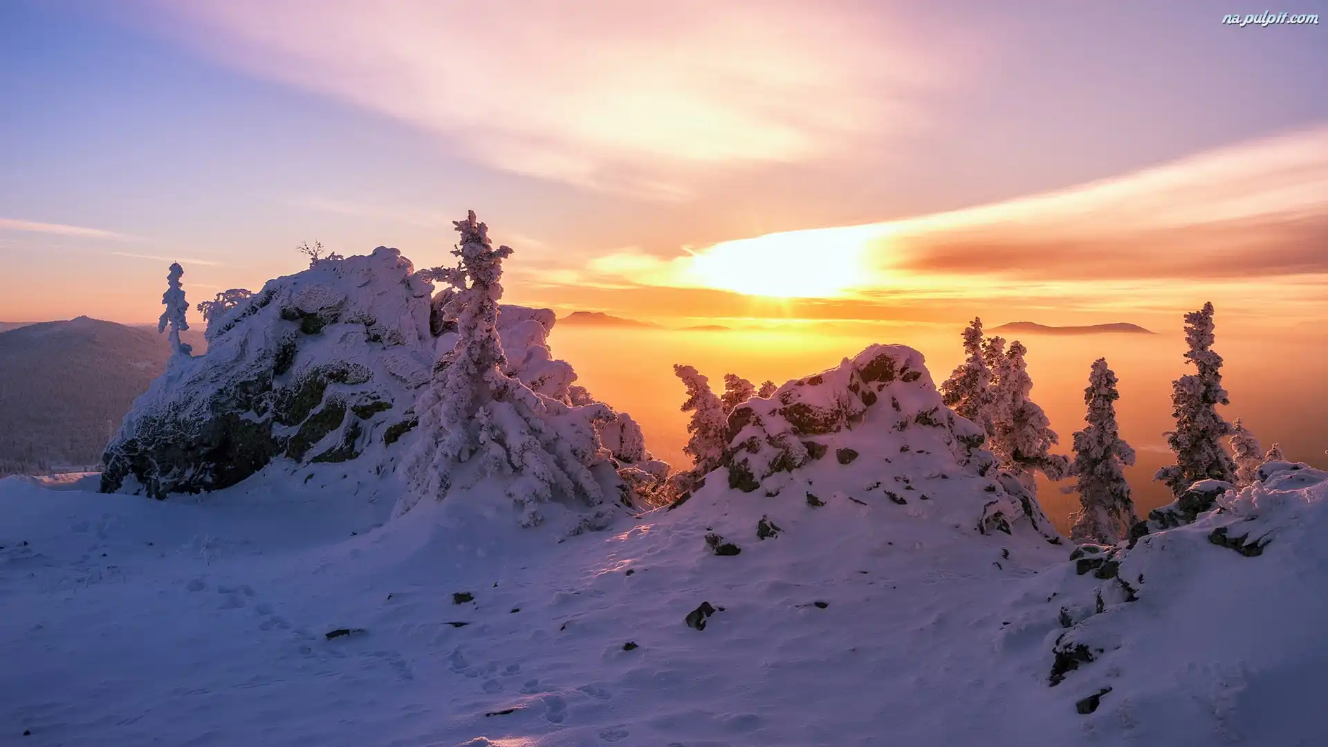 Góry, Wschód słońca, Zima, Drzewa, Wzgórza, Mgła Na Pulpit
